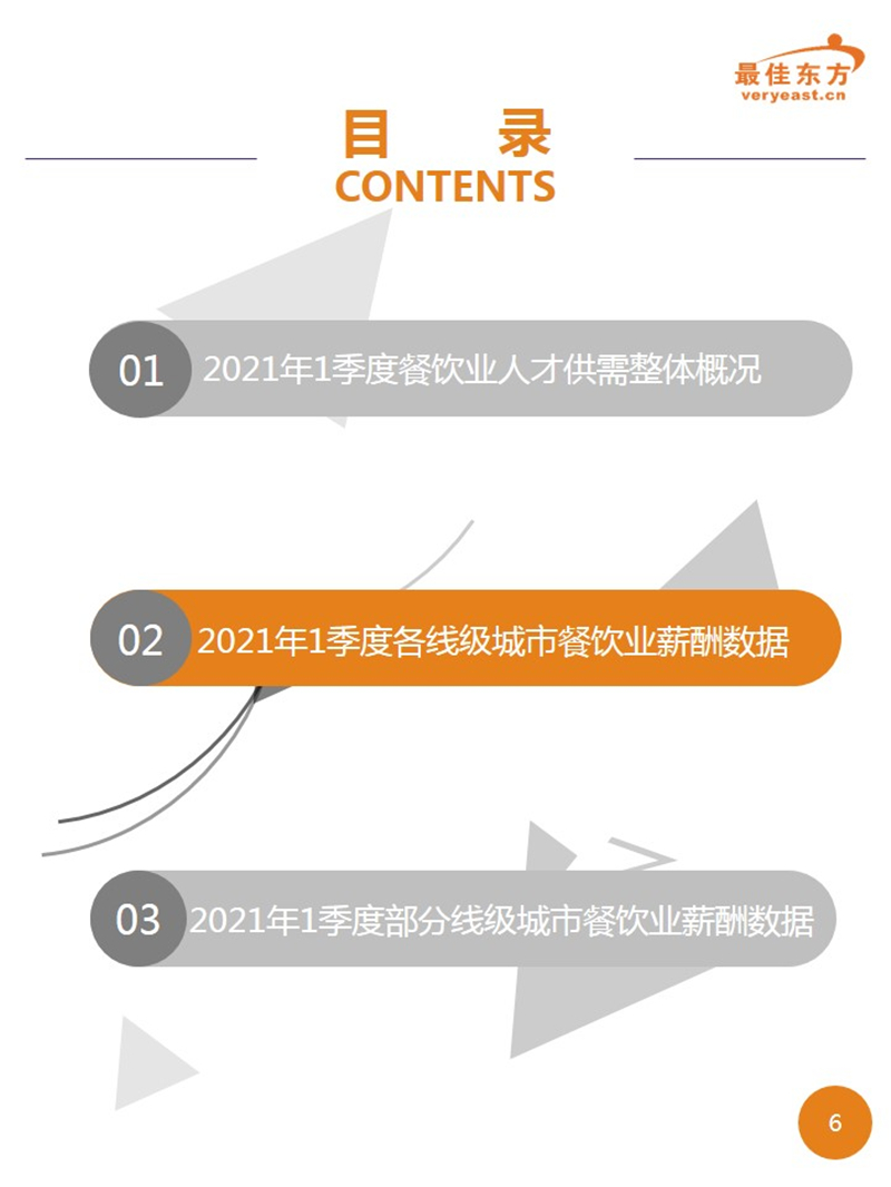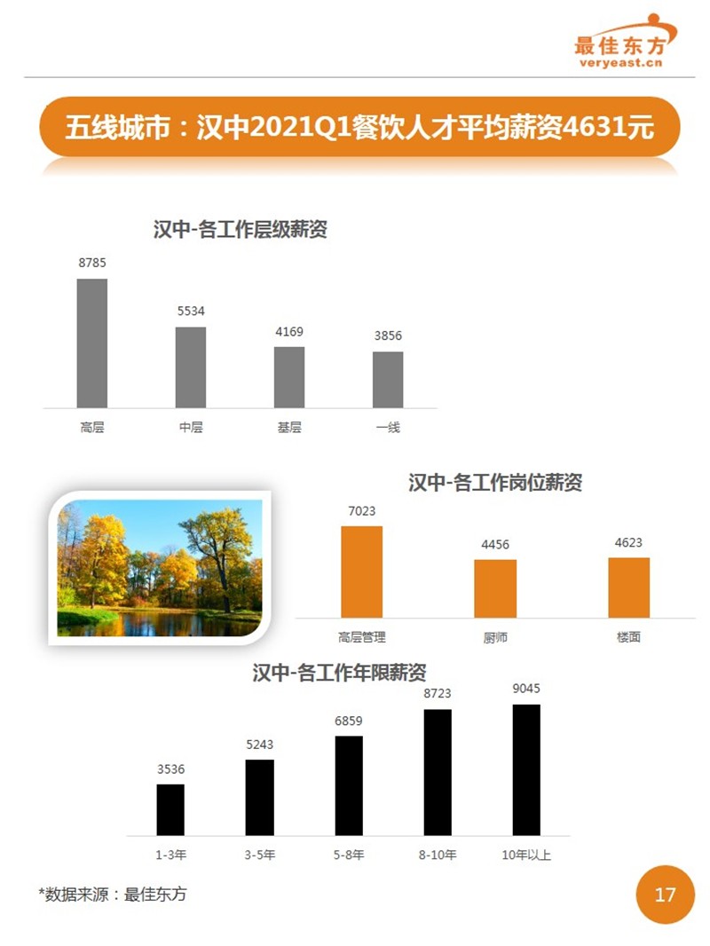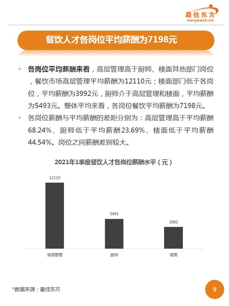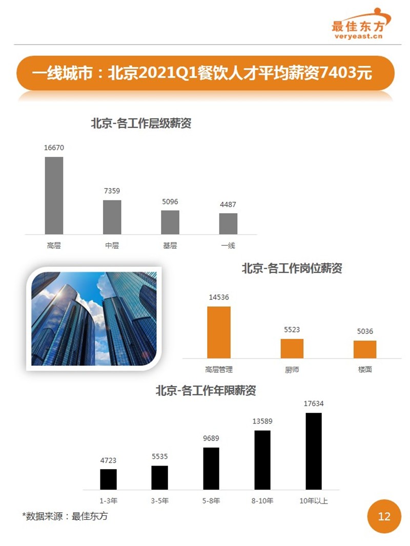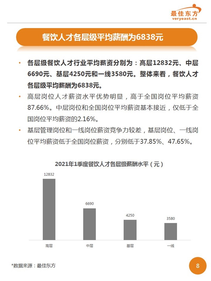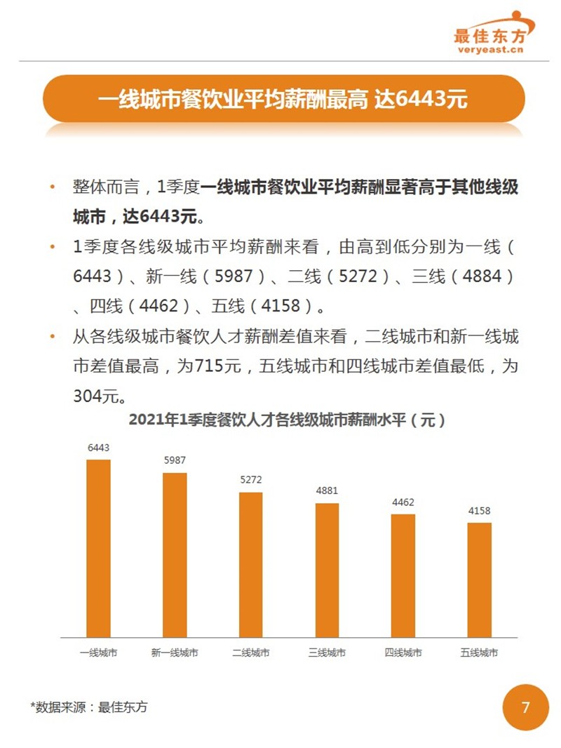 2021年1季度餐饮业人才薪酬数据报告 最佳东方 · 2021-07-05 08:49:15 分享到 打开微信“扫一扫”,打开网页后点击屏幕右上角分享按钮。 一线城市餐饮业平均薪酬达6443元。 餐饮 薪酬报告 0