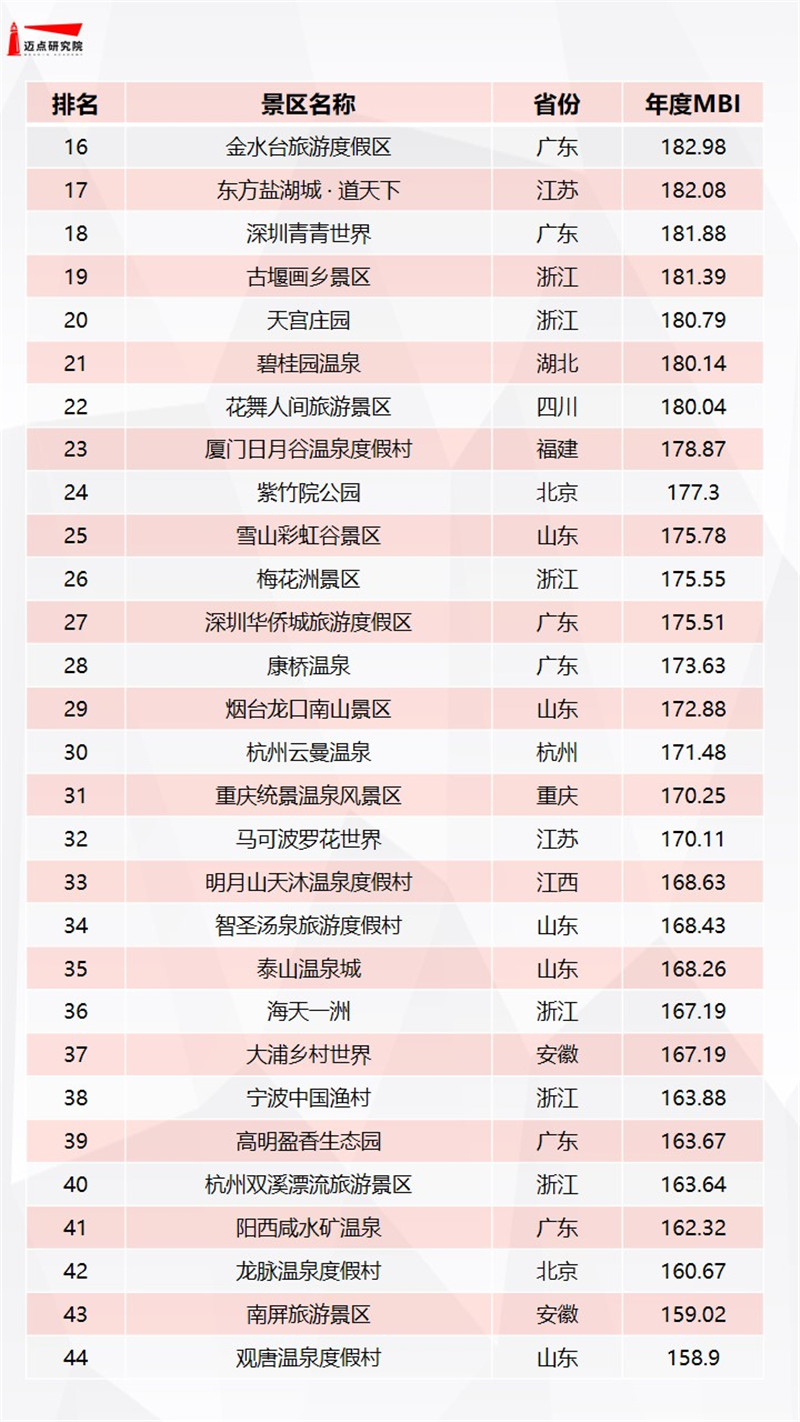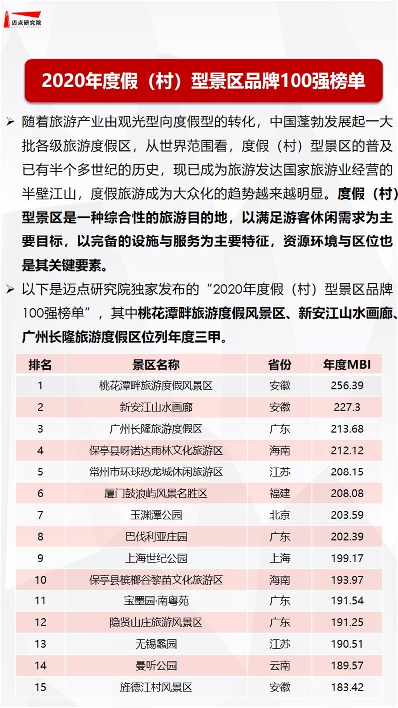 2020年度假(村)型景区品牌100强榜单 迈点研究院 · 赖芳 · 2021-07-27 08:45:00 分享到 打开微信“扫一扫”,打开网页后点击屏幕右上角分享按钮。 桃花潭畔旅游度假风景区、新安江山水画廊、广州长隆旅游度假区位列年度三甲 度假村 百强榜单 年度 0