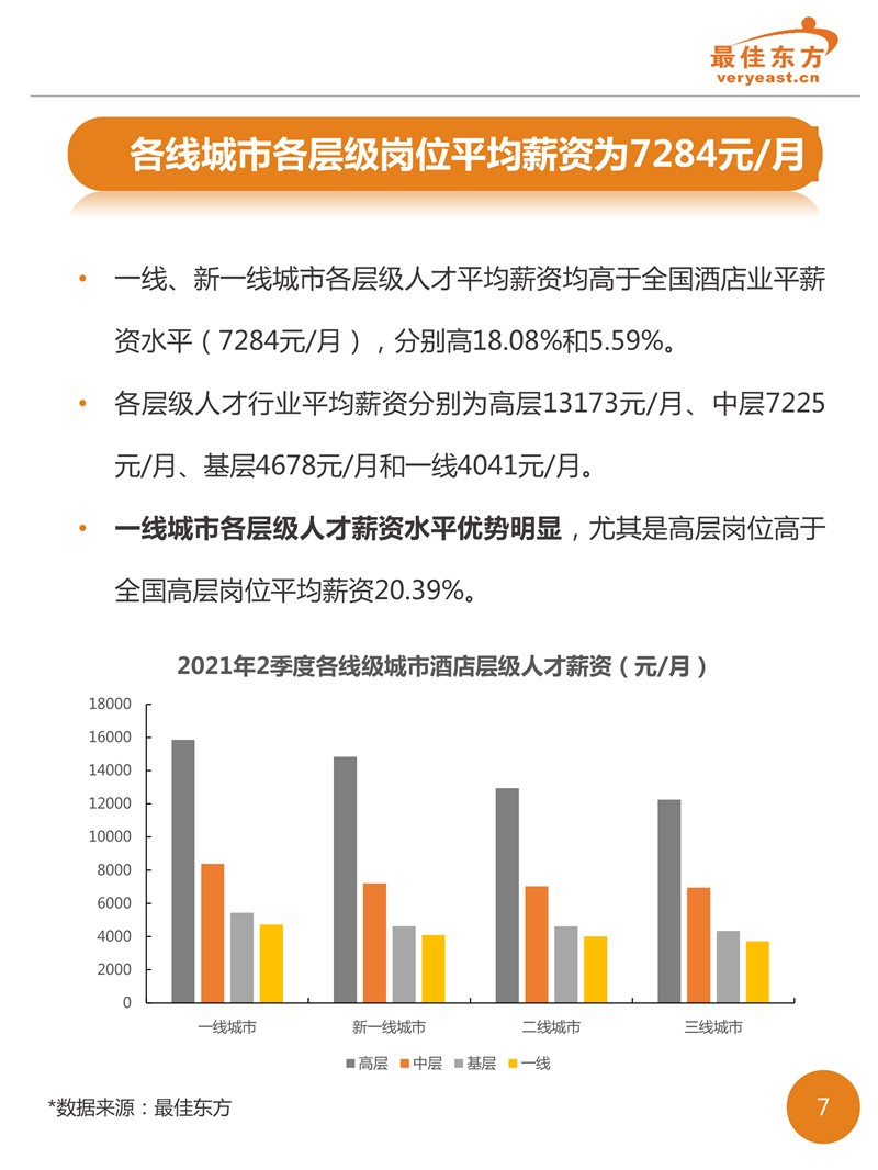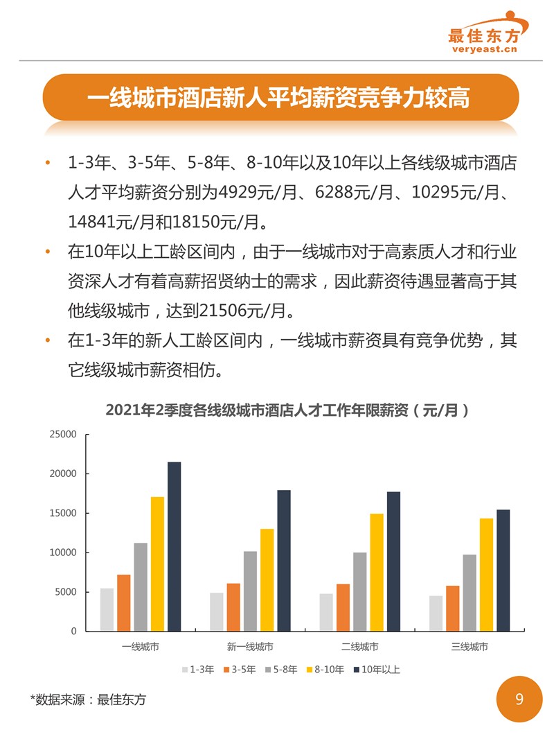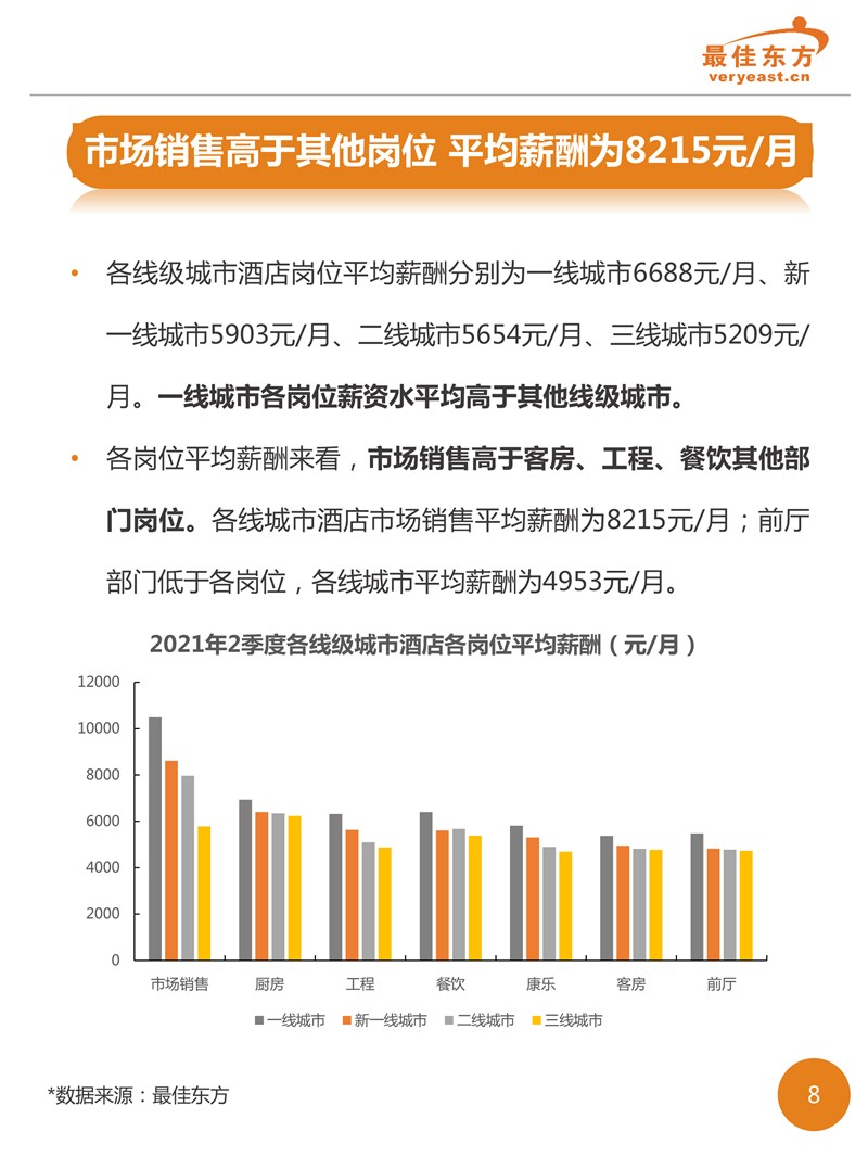 2021年2季度酒店业人力薪酬数据报告 最佳东方 · 2021-08-17 08:00:00 分享到 打开微信“扫一扫”,打开网页后点击屏幕右上角分享按钮。 各线级城市酒店岗位平均薪酬分别为一线城市6688元/月、新一线城市5903元/月、二线城市5654元/月、三线城市5209元/月。 酒店 薪酬报告 1