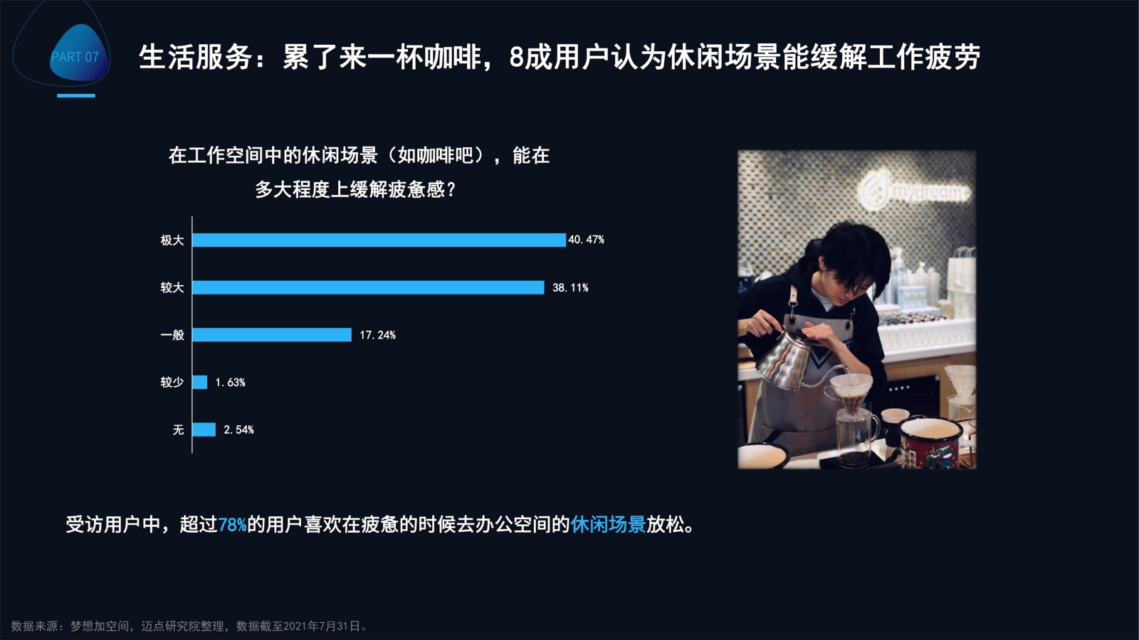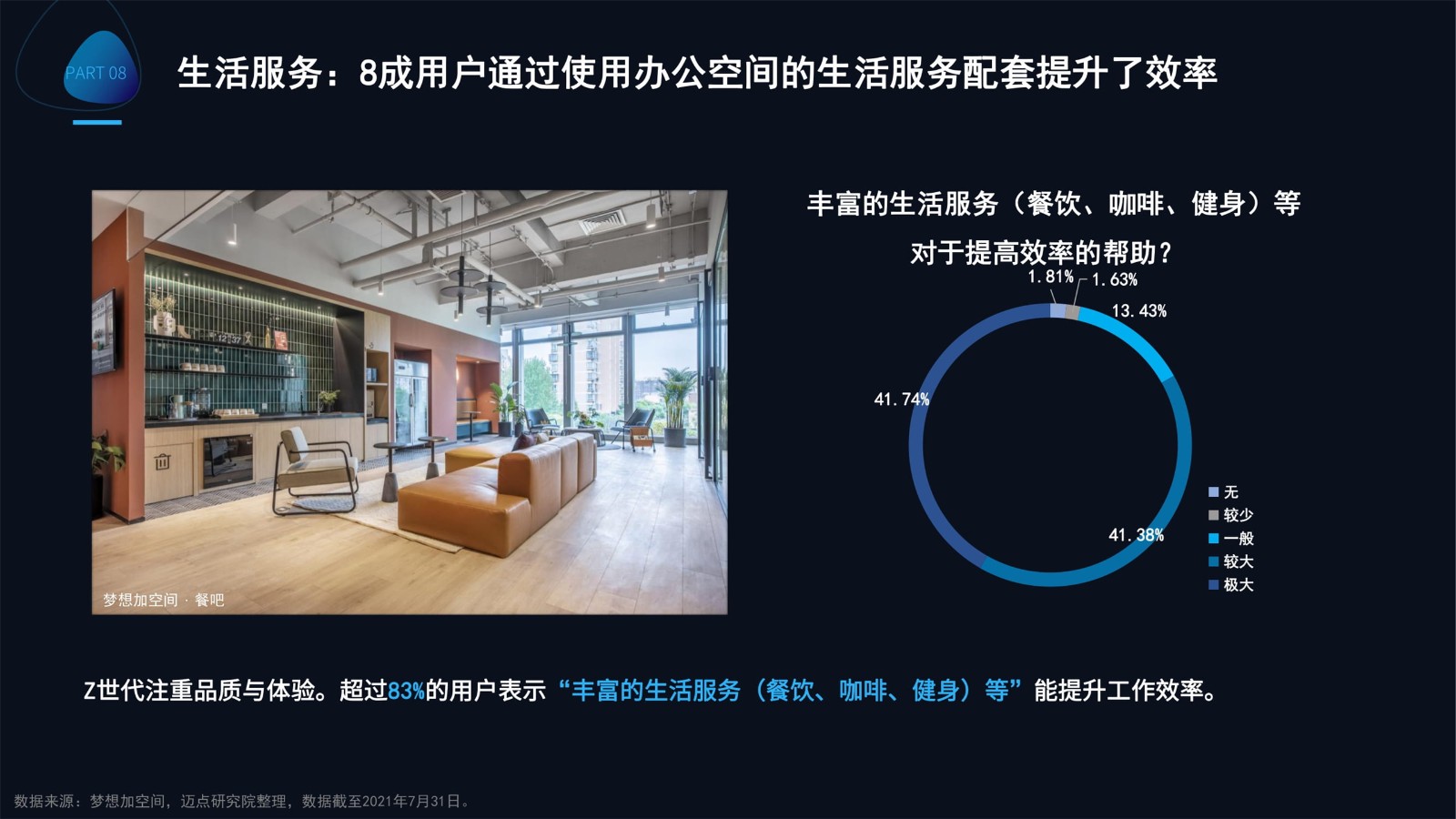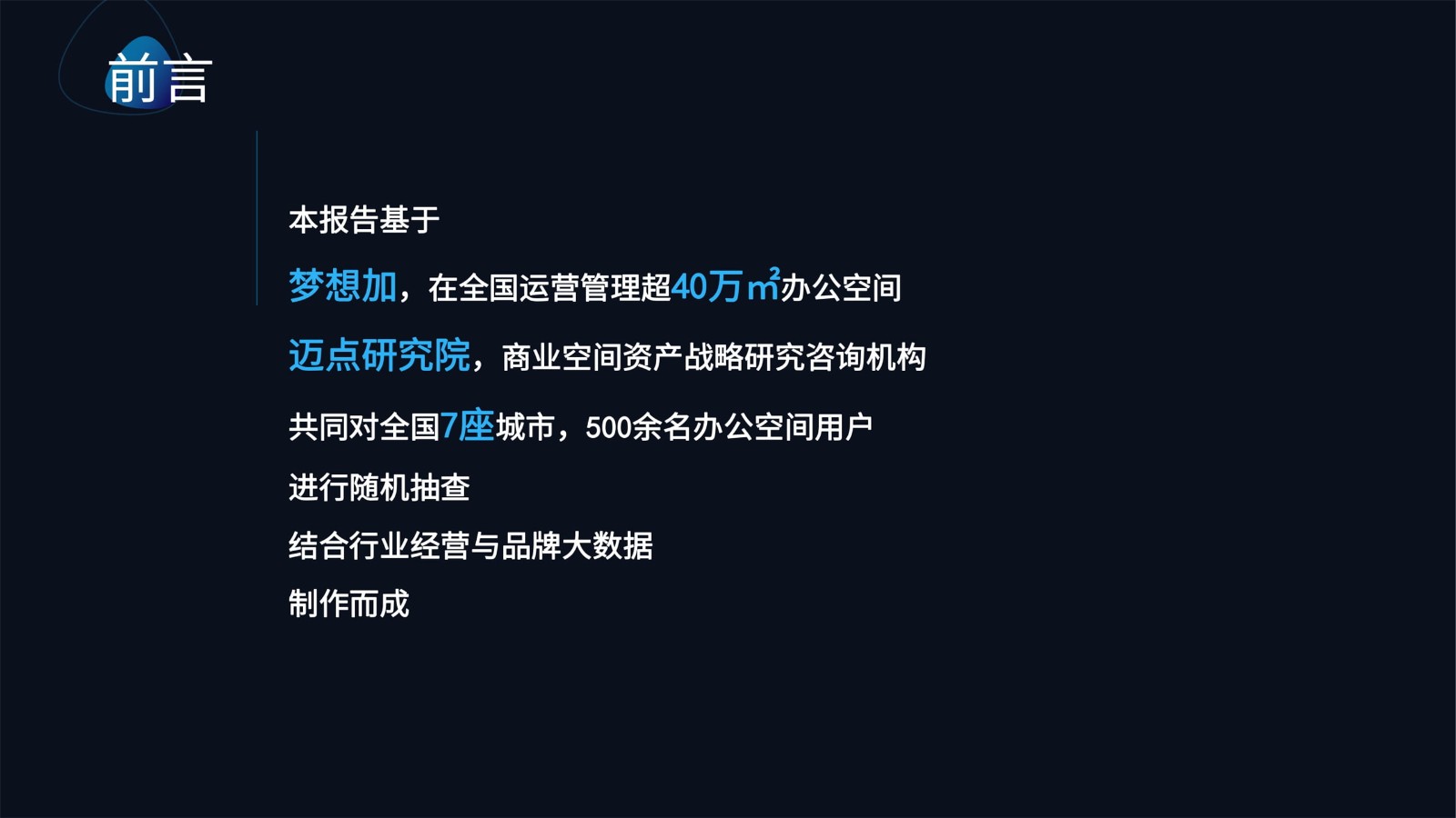 梦想加空间(办公空间品牌及服务商)与迈点研究院(商业空间资产战略咨询机构)强强联合,共同对全国7座城市、50多个办公空间的500余名用户进行抽查,通过问卷调研、数据分析,结合行业大数据和专业算法,精心制作《Z世代办公行为报告(2021)》。谨以此报告献给心怀梦想的Z世代职场年轻人与所有关心办公空间行业的从业者。让我们一起期待“更哇哦的职场,更了不起的梦想”!