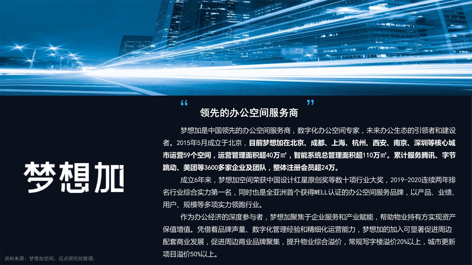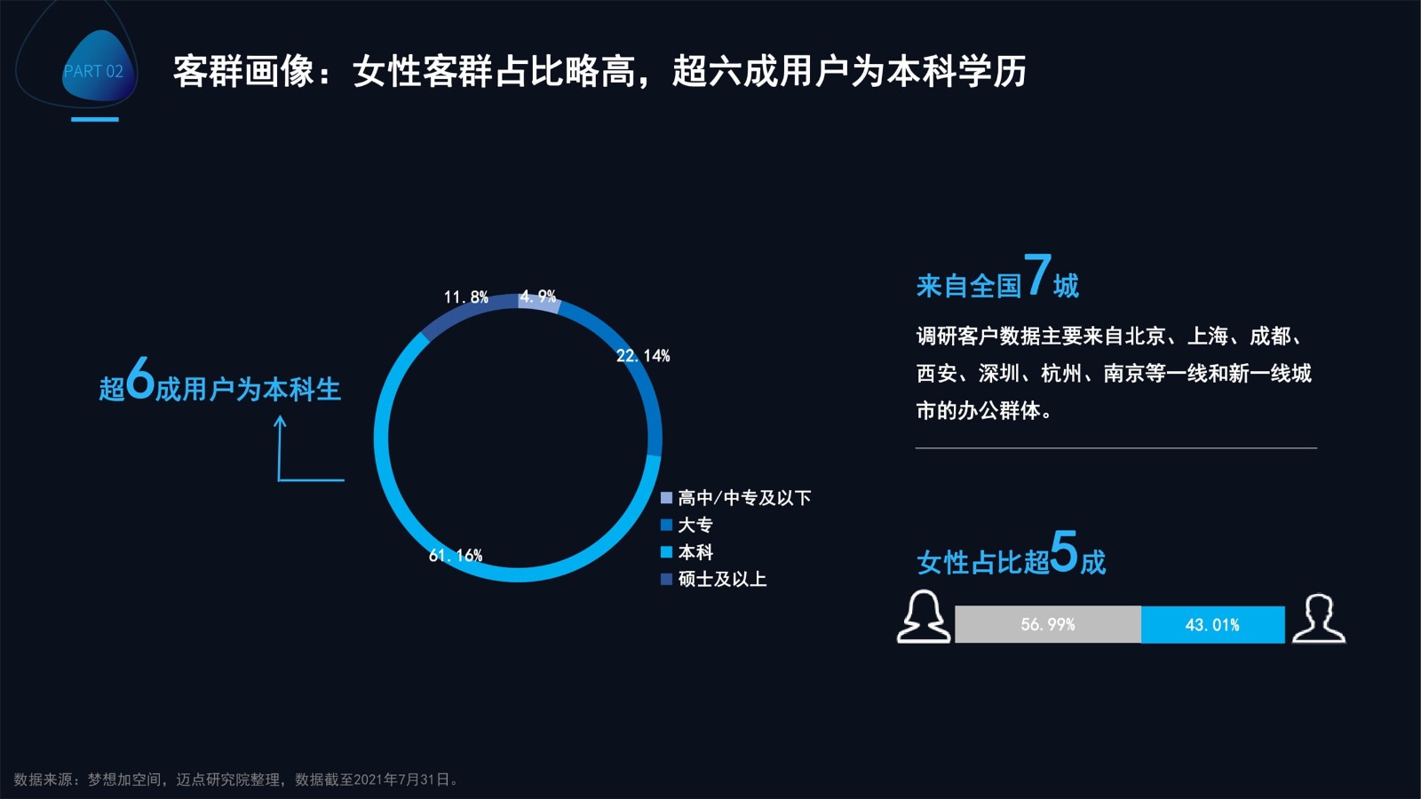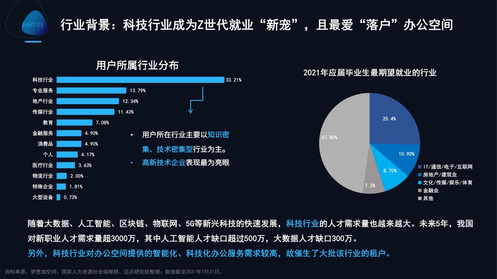梦想加空间(办公空间品牌及服务商)与迈点研究院(商业空间资产战略咨询机构)强强联合,共同对全国7座城市、50多个办公空间的500余名用户进行抽查,通过问卷调研、数据分析,结合行业大数据和专业算法,精心制作《Z世代办公行为报告(2021)》。谨以此报告献给心怀梦想的Z世代职场年轻人与所有关心办公空间行业的从业者。让我们一起期待“更哇哦的职场,更了不起的梦想”!