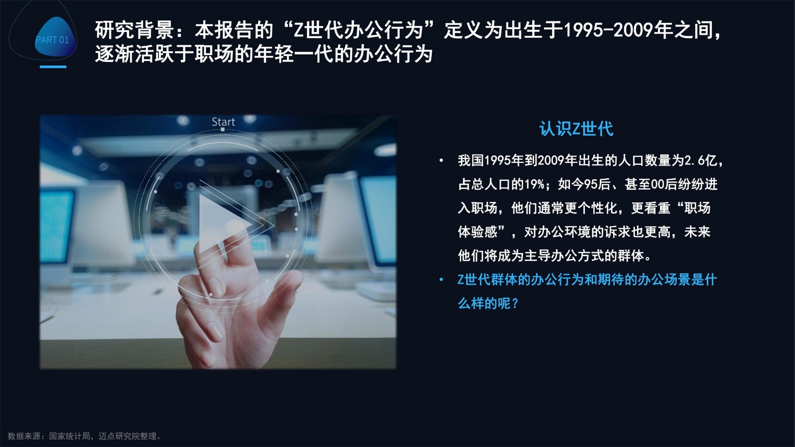 如今95后、甚至00后纷纷进入职场。据统计,我国1995年到2009年出生的人口数量为2.6亿,占总人口的19%。特殊的成长环境造就了这批年轻人在办公行为、工作习惯和观念等方面有着鲜明的特点,与传统意义上的“职场人”产生了较大的区别。他们通常更个性化,更看重“职场体验感”,对办公环境的诉求也更高。未来他们将成为我国主导办公方式的群体。
