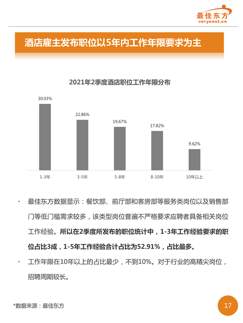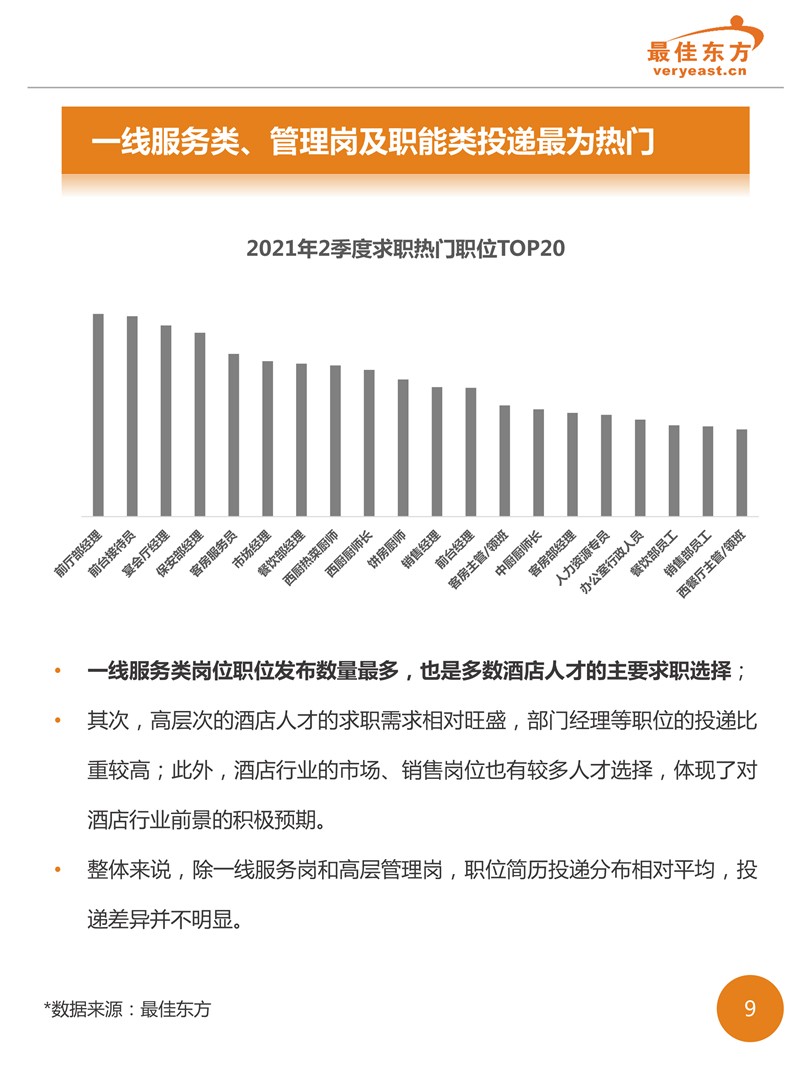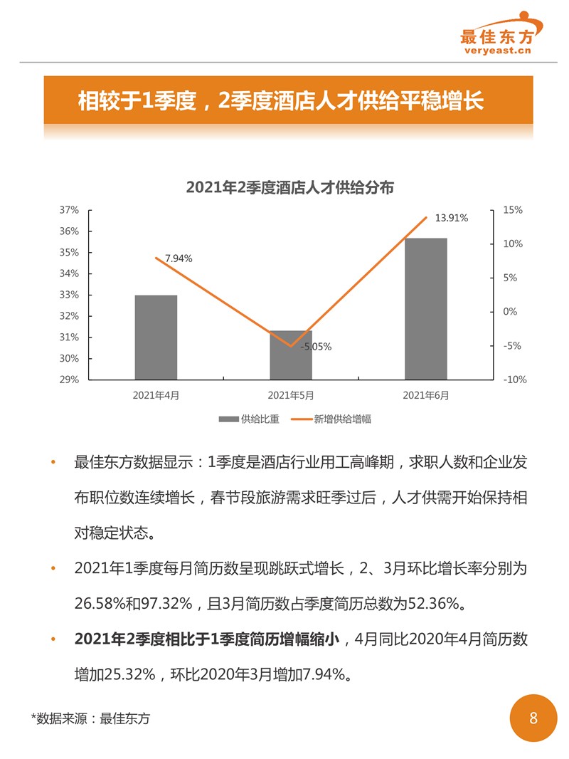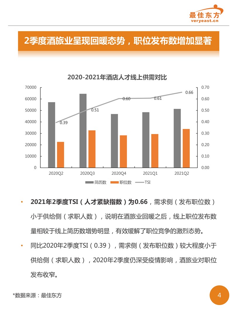 2021年2季度酒店人才供需数据报告 最佳东方 · 2021-09-18 08:00:00 分享到 打开微信“扫一扫”,打开网页后点击屏幕右上角分享按钮。 2021年2季度酒旅业回暖之后,线上职位发布数量相较于线上简历数增势明显,有效缓解了职位竞争的激烈态势。 酒店 人力资源 数据 0