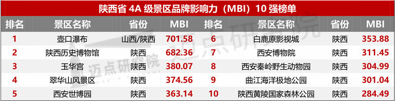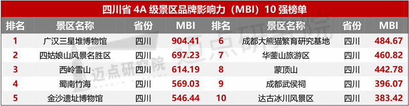 广汉三星堆博物馆、上海博物馆、北京欢乐谷、壶口瀑布、四姑娘山风景名胜区、陕西历史博物馆、平山湖大峡谷、西江千户苗寨、龙脊梯田、酒泉卫星发射中心位列TOP10。