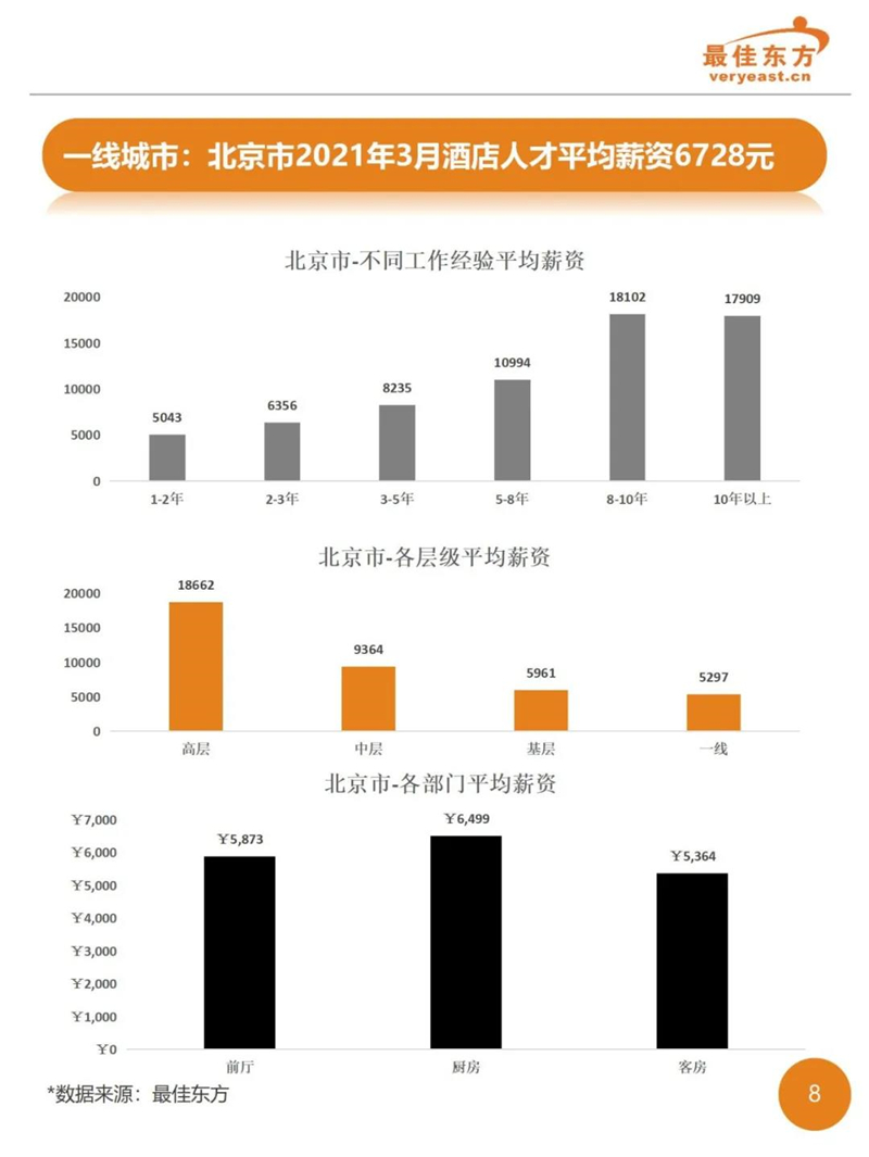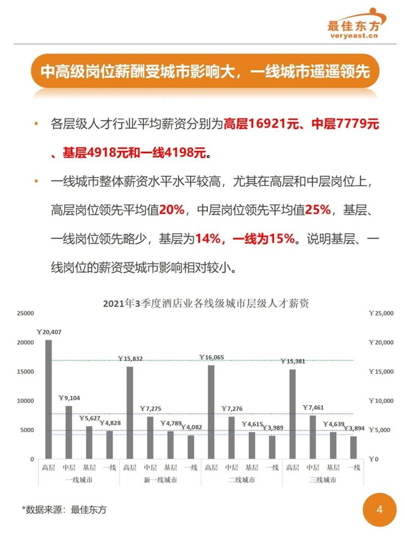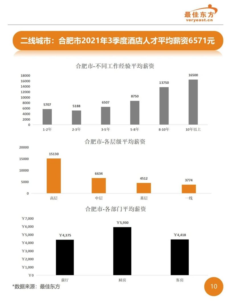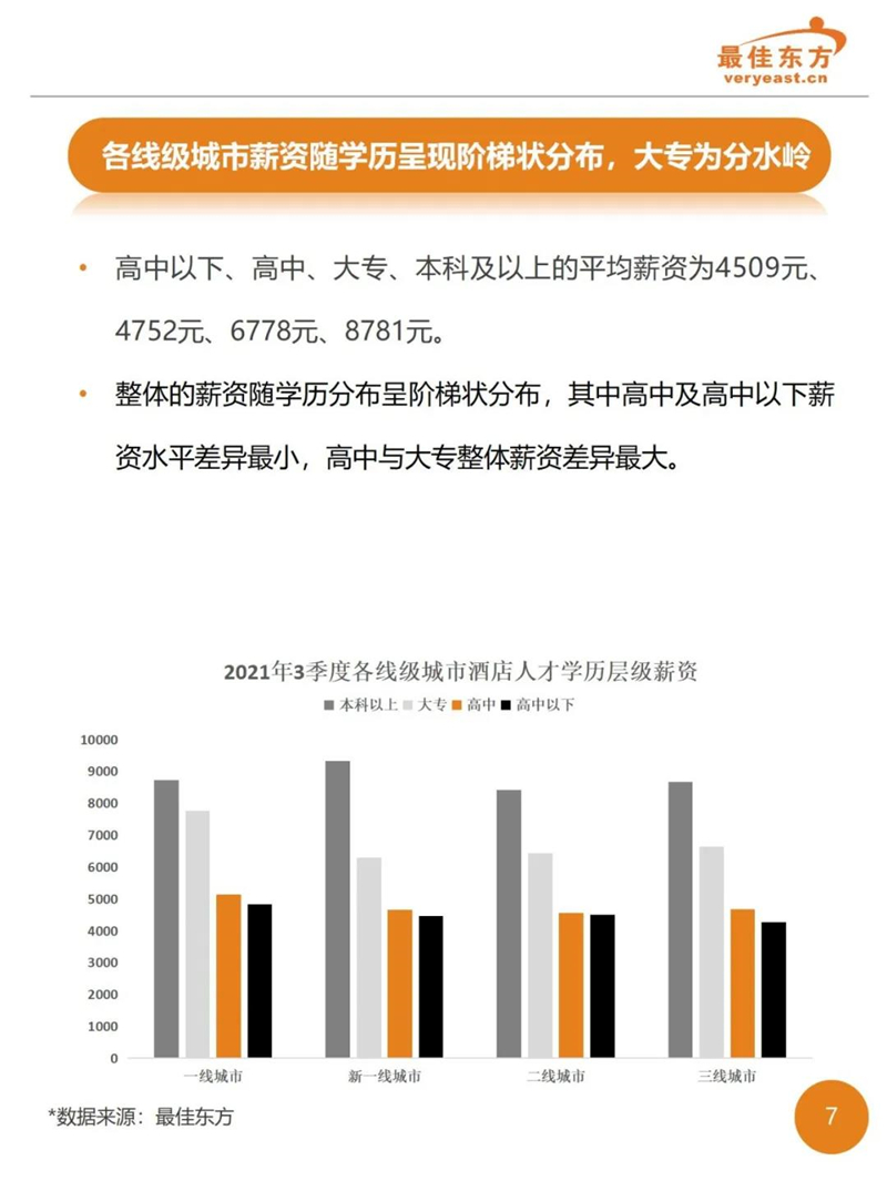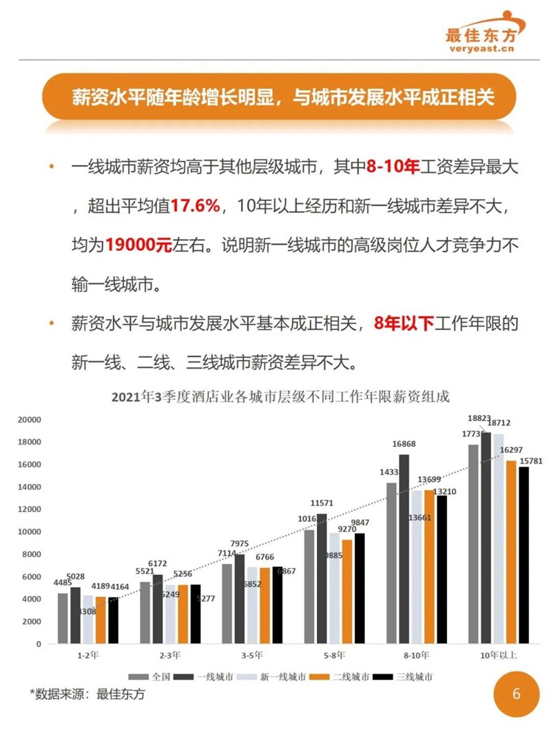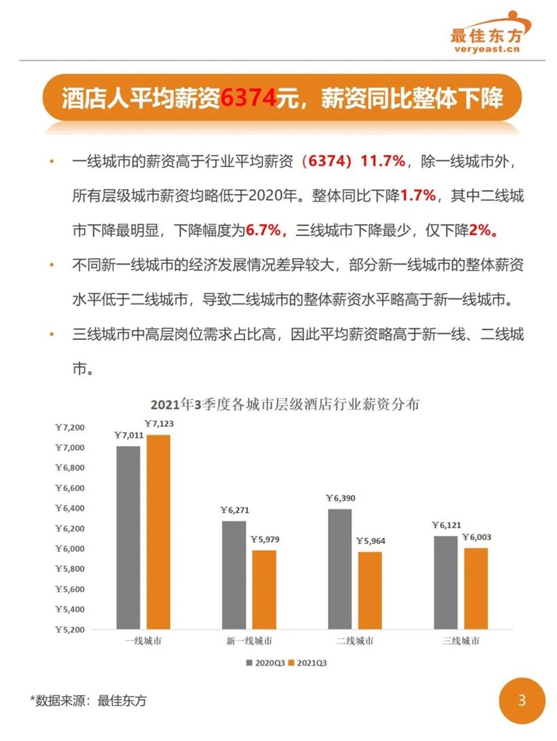 2021年3季度酒店业人力薪酬数据报告 最佳东方 · 2021-10-31 15:27:14 分享到 打开微信“扫一扫”,打开网页后点击屏幕右上角分享按钮。 2021年Q3酒店人平均薪资6374,薪资整体同比下降。 酒店 薪酬报告 0