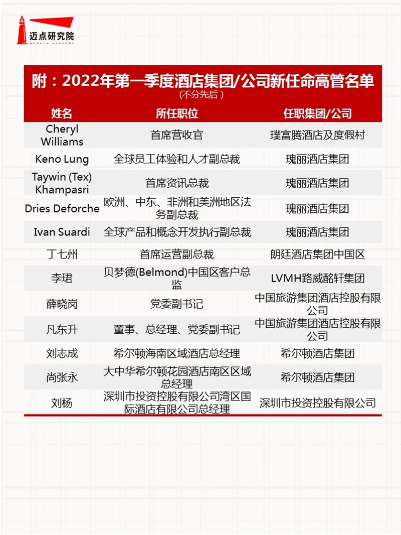 2022年第一季度酒店业高层人事变动统计报告 迈点研究院 · 吴伊超 · 2022-03-28 08:30:07 分享到 打开微信“扫一扫”,打开网页后点击屏幕右上角分享按钮。 2022年第一季度全国酒店及酒店集团/公司共新任命101位高管,其中集团/公司总部任命12位。 人事变动统计报告 1