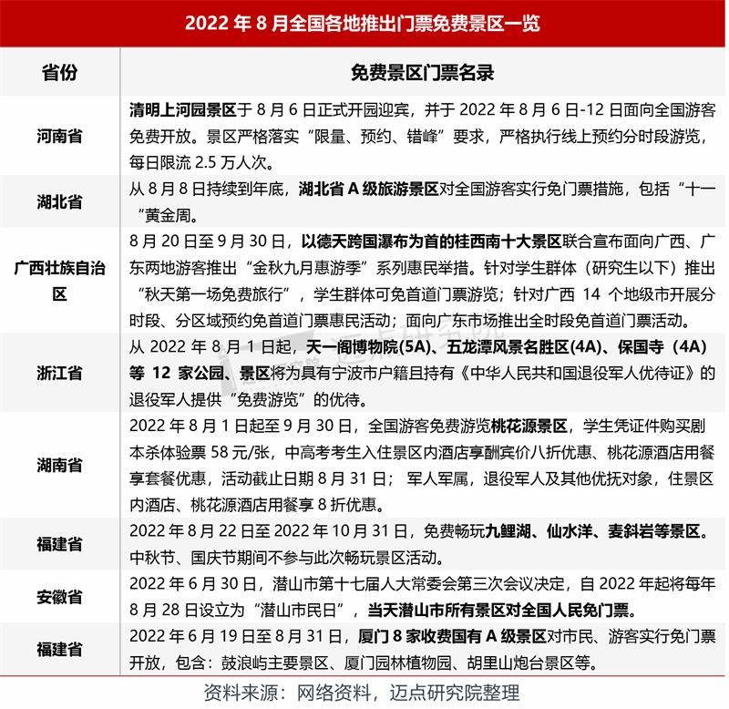 8月,各地景区在持续贯彻落实“限量、预约、错峰”要求下,陆续开展免费游或优惠游活动,文旅消费活力持续释放,各地景区数据喜人。数据显示,8月8日起,湖北省A级旅游景区对全国游客实行免门票措施;截至8月23日,恢复开放的372家A级景区已经有162家的游客量达到或超过去年同期水平。同时,华山景区自6月免门票以来,客流量恢复疫情前水平,日均接待2万人次,两个月突破57万。