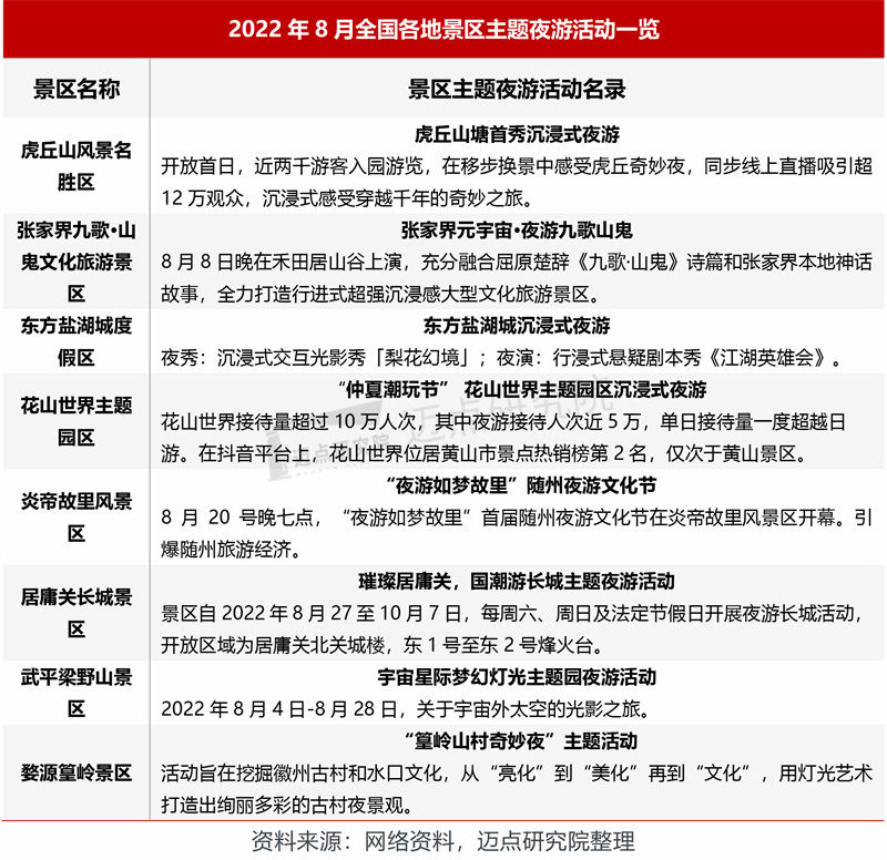 主题夜游点亮新消费:近年来,尤其是今年高温酷暑的催生,各城市夜游经济发展迅速,盘活多元化旅游新业态,点亮夜游经济已经成为刺激居民消费,增强经济活力的重要手段之一。8月,各地景区积极打造内容丰富、形式多样的夜游活动,营造旅游新的增长点。花山世界主题园打造以“仲夏潮玩节” 为主题的沉浸式夜游花山世界活动,游客接待量超过10万人次,其中夜游接待人次近5万,单日接待量一度超越日游。在抖音平台上,位居黄山市景点热销榜第2名,仅次于黄山景区。