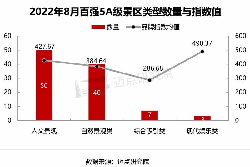 5A级景区百强榜单中,人文景观、自然景观遥遥领先,分别占据50个席位和40个席位;细分类型中,以历史遗址型景区、山岳型景区和山水型景区为主,分别占据31、14和9席。从品牌指数来看,8月5A级景区各类型板块中品牌指数由高到低分别为:现代娱乐类景区(490.37)、人文景观类景区(427.67)、自然景观类景区(384.64)、综合吸引类景区(286.68)。现代娱乐类景区名列前茅,表现良好,细分类型品牌指数由高到低分别为:海滨型景区(596.98)、文化场馆型景区(596.48)、文化演艺型景区(518.79)。