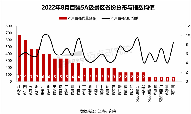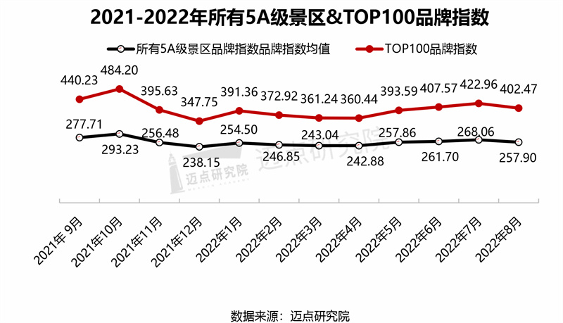 经迈点研究院监测,8月5A级景区品牌指数略有回落,所有5A级景区的平均品牌指数为257.90,环比下降3.79%;8月100强5A级景区MBI品牌指数均值为402.47,环比下降4.84%。