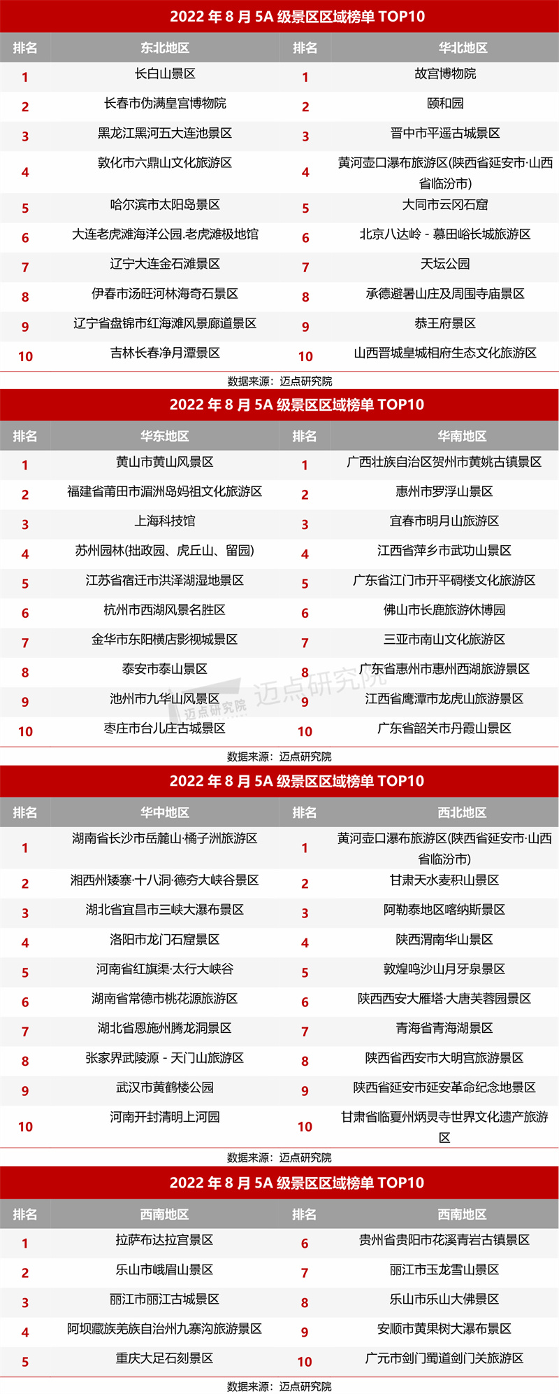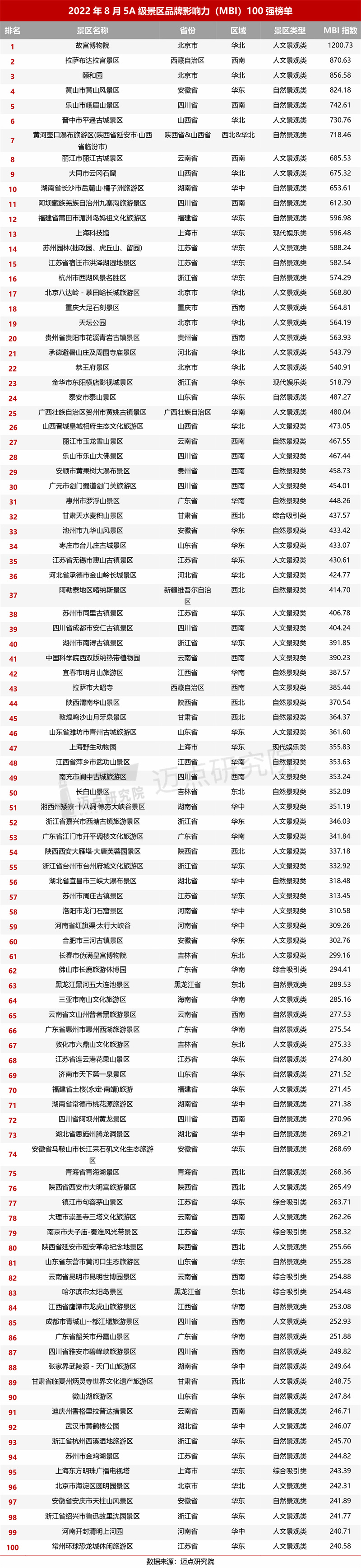 以下是迈点研究院独家发布“2022年8月5A级景区品牌影响力(MBI)100强榜单”。8月,故宫博物院、拉萨布达拉宫景区、颐和园景区位列前三甲,黄山市黄山风景区、乐山市峨眉山景区、晋中市平遥古城景区、黄河壶口瀑布旅游区(陕西省延安市·山西省临汾市)、丽江市丽江古城景区、大同市云冈石窟、湖南省长沙市岳麓山·橘子洲旅游区等跻身榜单前十。