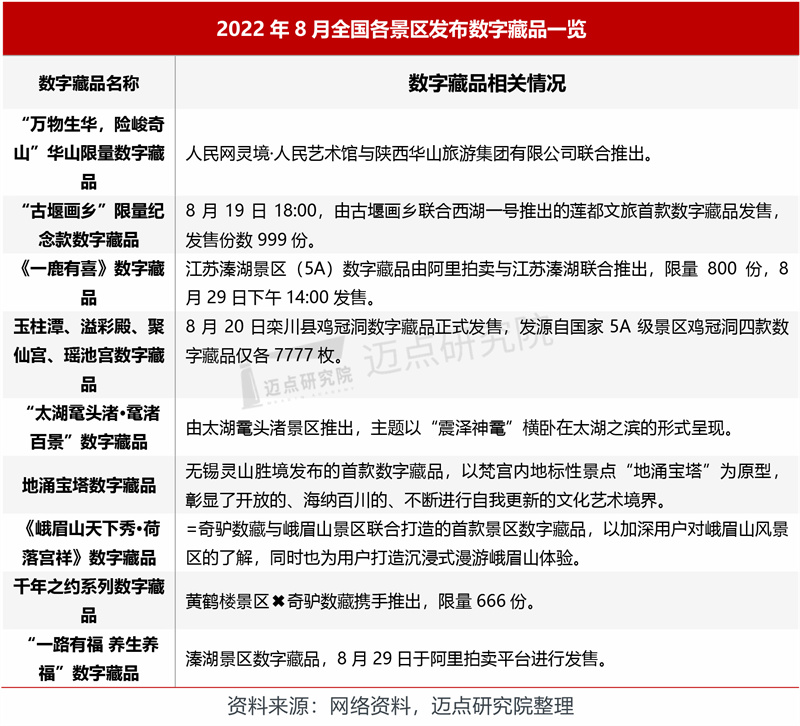 数字藏品文旅新业态:自数字藏品文创新业态进入人们的视野以来热度不减反增,各地景区纷纷进军数字藏品领域,努力促进了文旅融合的数字转化,提高旅游主题的消费价值感 。由景域驴妈妈旗下“奇驴数藏”与峨眉山景区联合打造的首款景区数字藏品《峨眉山天下秀•荷落宫祥》正式公开发售;8月20日,栾川县鸡冠洞数字藏品正式发售,发源自国家5A级景区鸡冠洞四款数字藏品仅各7777枚。数字藏品作为文旅IP衍生物,强烈的文化属性成为景区快速切入元宇宙的契机。