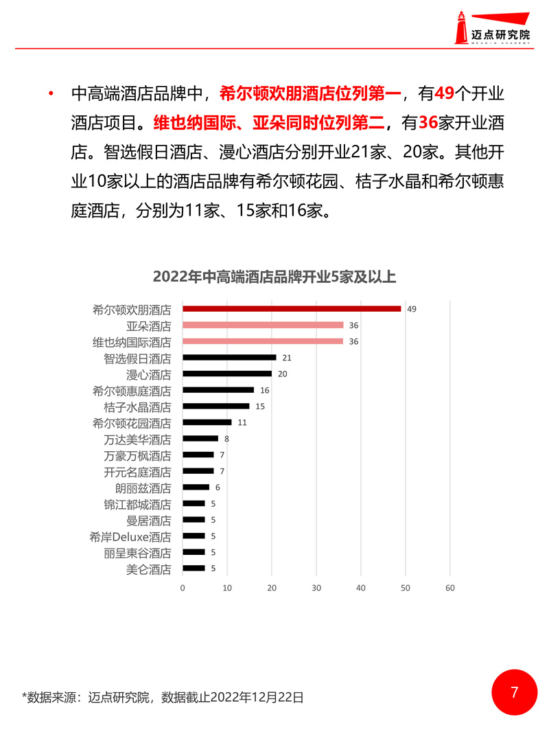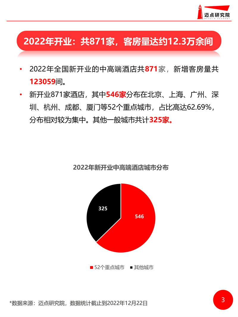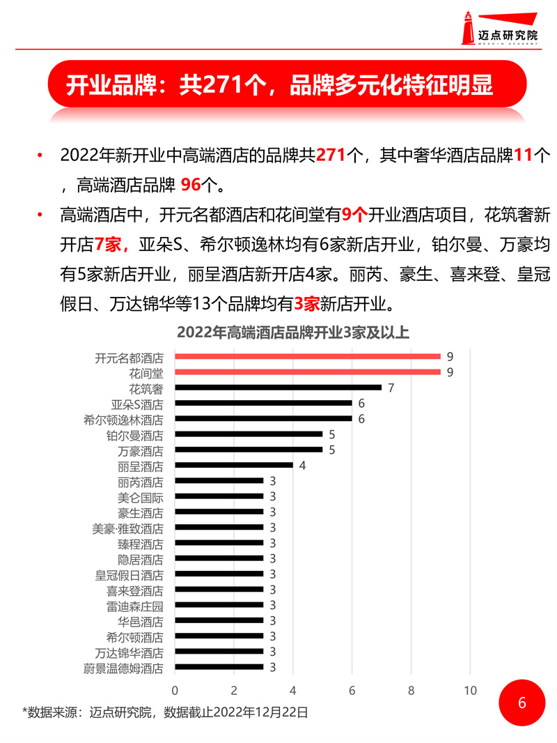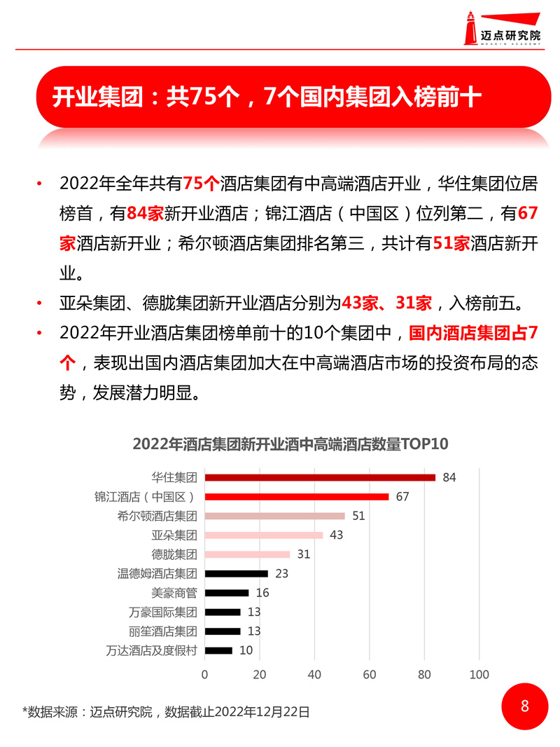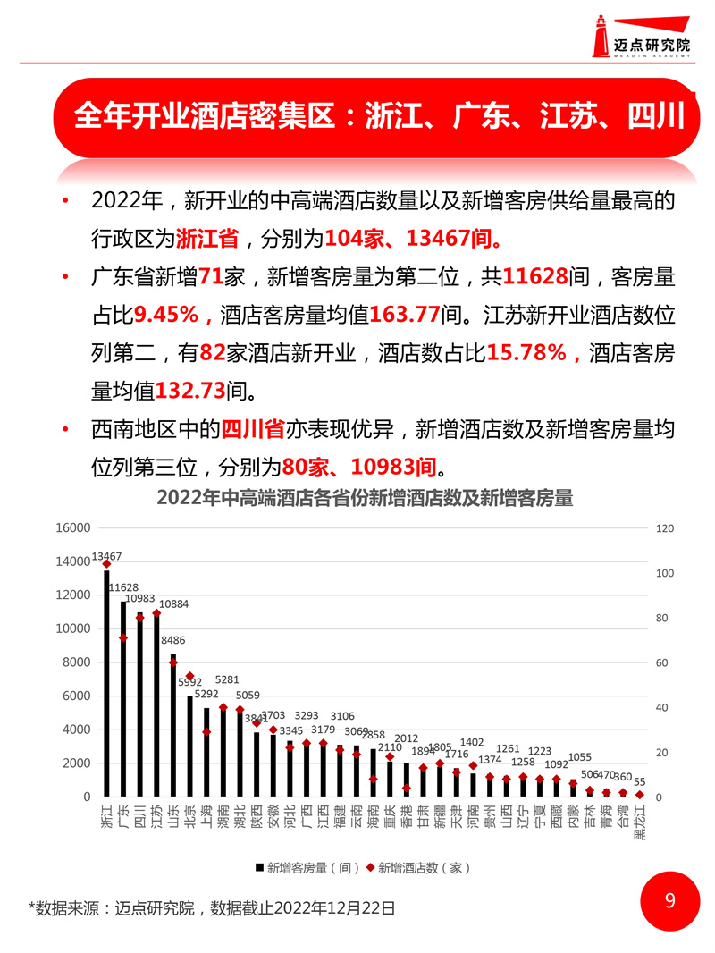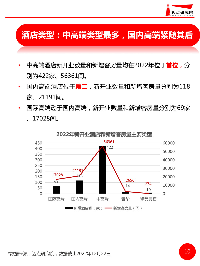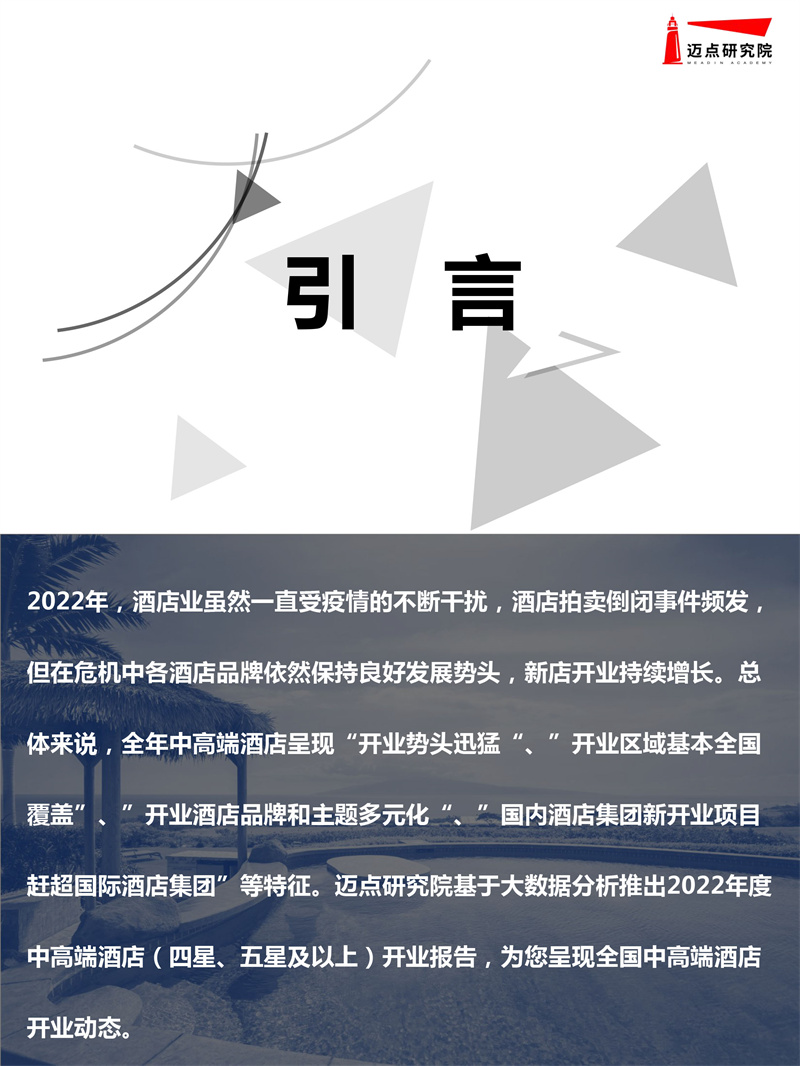 2022年度全国中高端酒店开业统计报告 迈点研究院 · 邢晶晶 · 2022-12-27 09:21:11 分享到 打开微信“扫一扫”,打开网页后点击屏幕右上角分享按钮。 全年中高端酒店呈现“开业势头迅猛“、”开业区域基本全国覆盖”、”开业酒店品牌和主题多元化“、”国内酒店集团新开业项目赶超国际酒店集团”等特征。 酒店 开业报告 2