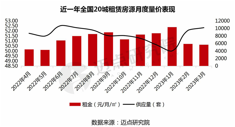3月整体租赁市场租金较为稳定,全国20城租赁房源租金50.63元/月/㎡,与上月变化不大。同比2022年3月,上升了0.05%。从供应量来看,正值开工旺季,供应量呈现快速恢复态势;随着春招季的到来,需求逐渐回升,挂牌量大幅增长,租赁市场持续回暖。