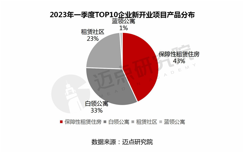 从TOP10企业新开业项目产品分布来看,保障性租赁住房为住房租赁企业广泛布局的产品,占比43%;其次是白领公寓和租赁社区,占比分别为33%和23%。对比去年同期,保障性租赁住房占比大幅上升,白领公寓和蓝领公寓份额都大幅下降。