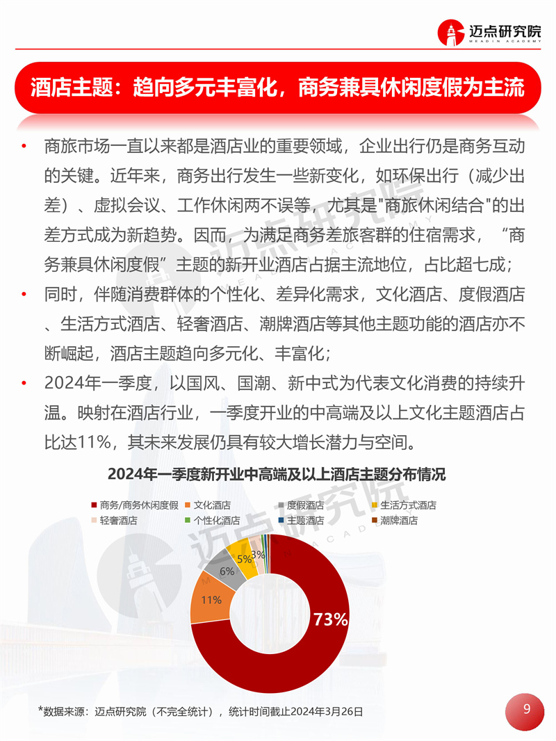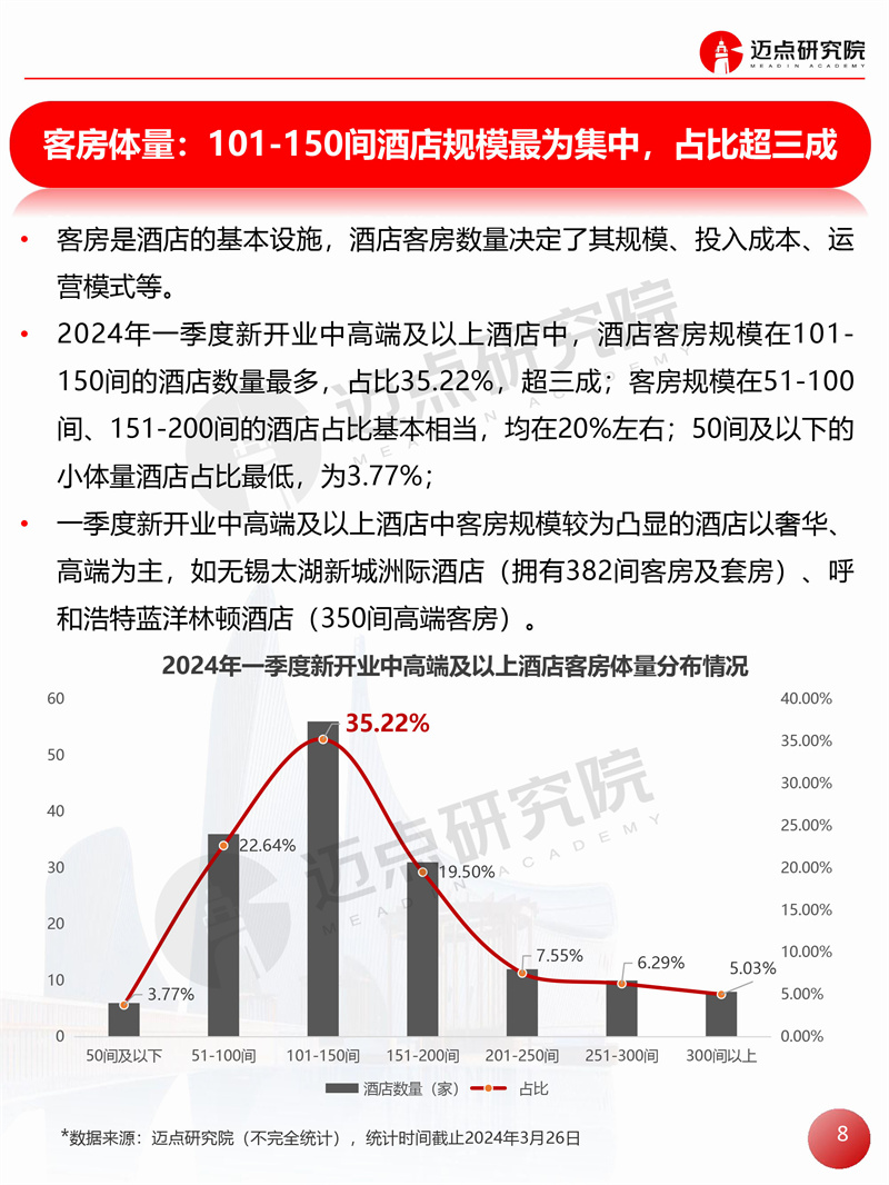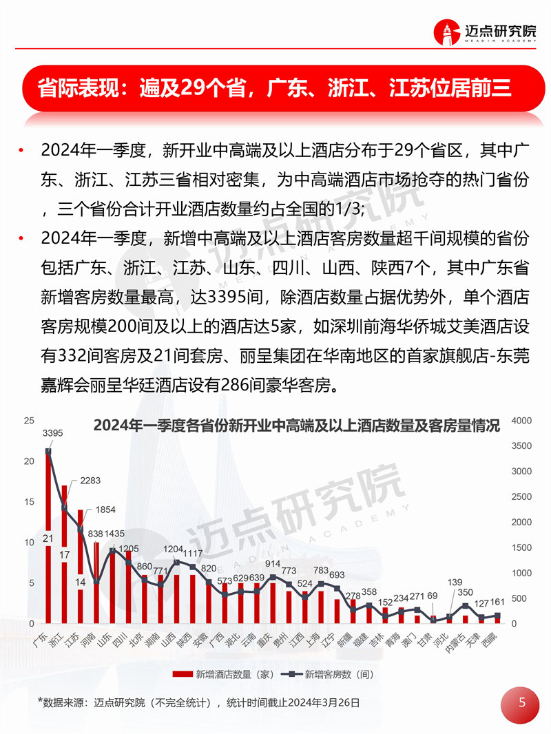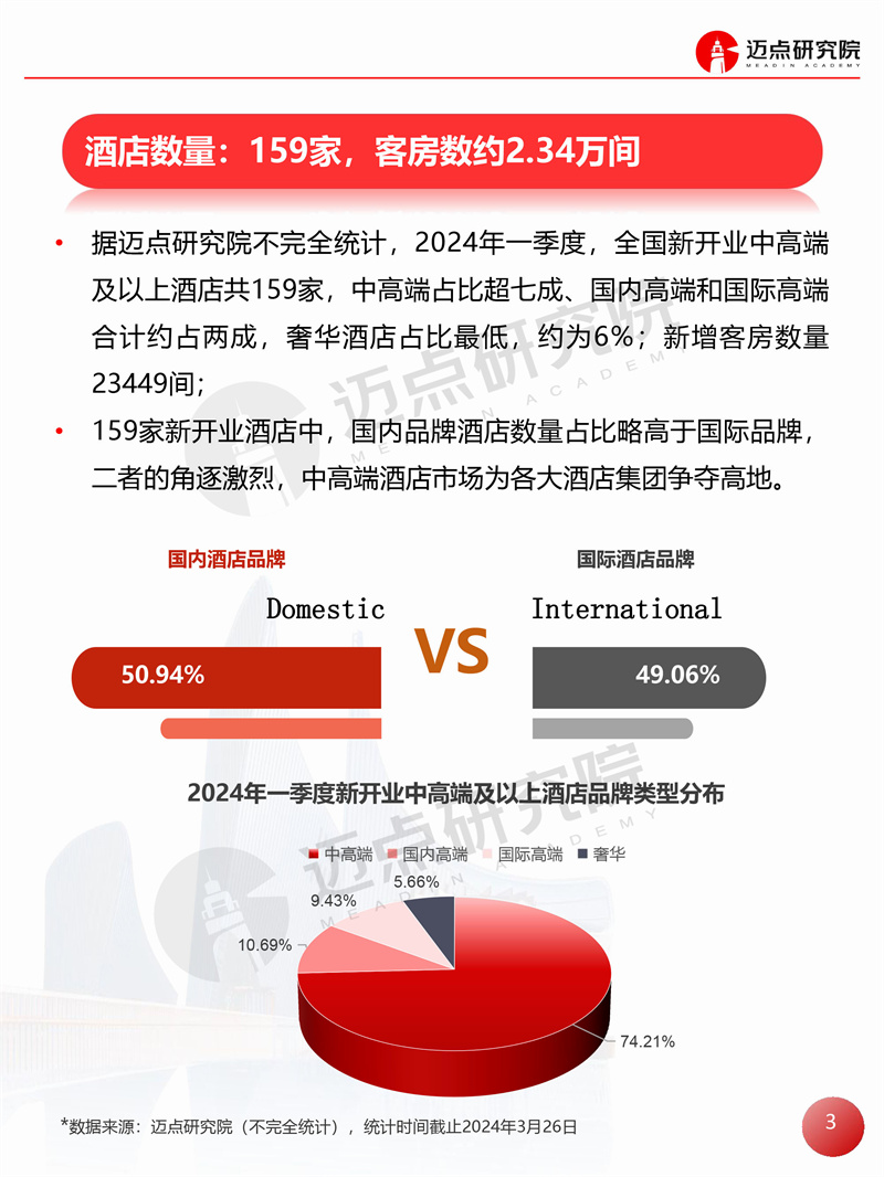 2024年一季度全国中高端及以上酒店开业统计报告 迈点研究院 · 邢晶晶 · 2024-03-29 08:51:01 分享到 打开微信“扫一扫”,打开网页后点击屏幕右上角分享按钮。 据迈点研究院不完全统计,2024年一季度全国新开业中高端及以上酒店159家,新增客房约2.34万间。 开业统计 酒店 0