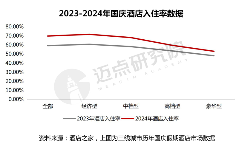 2024年国庆节假期,全国三线城市酒店的平均每间可出租房收入(RevPAR)为187.51元,相较于去年的151.21元上涨24%;平均入住率为69.78%,比去年国庆假期高10.57%;酒店平均房价268.72元,比去年增加13.34元。