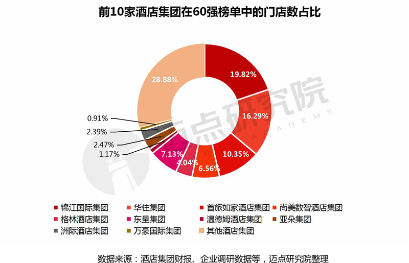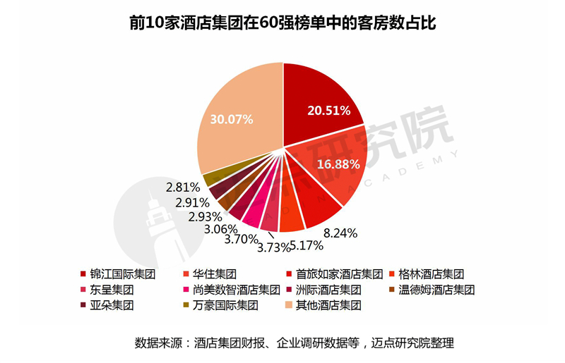 依据“2024年度中国酒店集团规模60强榜单”,规模前十的酒店集团依次为:锦江国际集团、华住集团、首旅如家酒店集团、格林酒店集团、东呈集团、尚美数智酒店集团、洲际酒店集团、温德姆酒店集团、亚朵集团、万豪国际集团。这十家酒店集团的客房总数约440万间,占全部连锁酒店客房规模的62.25%,同比2023年增加了5.89个百分点。表明头部酒店集团市场集聚效应持续强化,行业资源加速向优势企业汇聚,市场竞争格局加速分化。