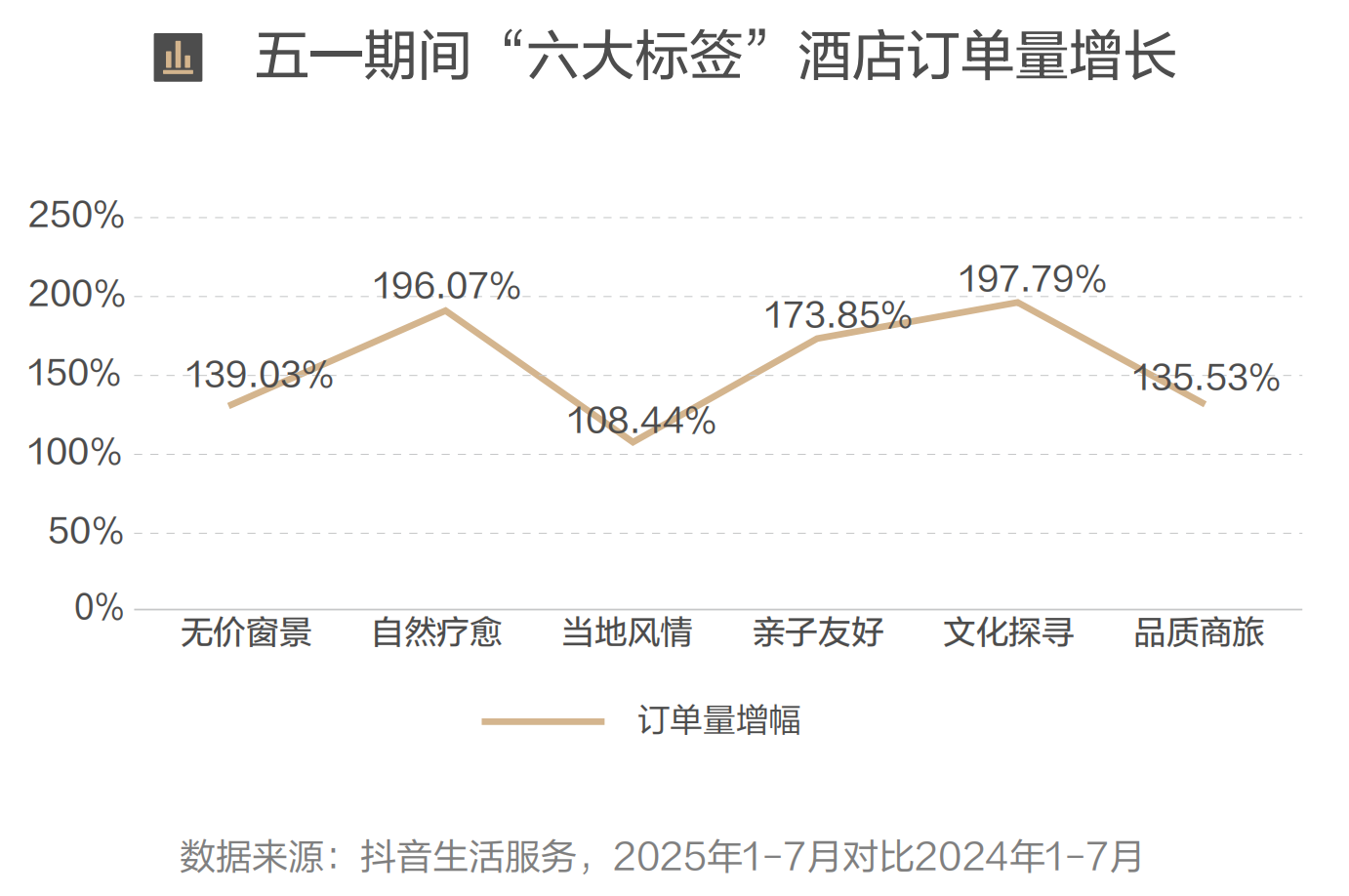 特色生活方式酒店都在玩抖音。2025年上半年,越来越多的特色生活方式酒店入驻抖音生活服务,实现“入驻即增长”。从订单量来看,2025年六大标签酒店全面超越2024年,且大部分标签酒店订单量实现翻倍增长。