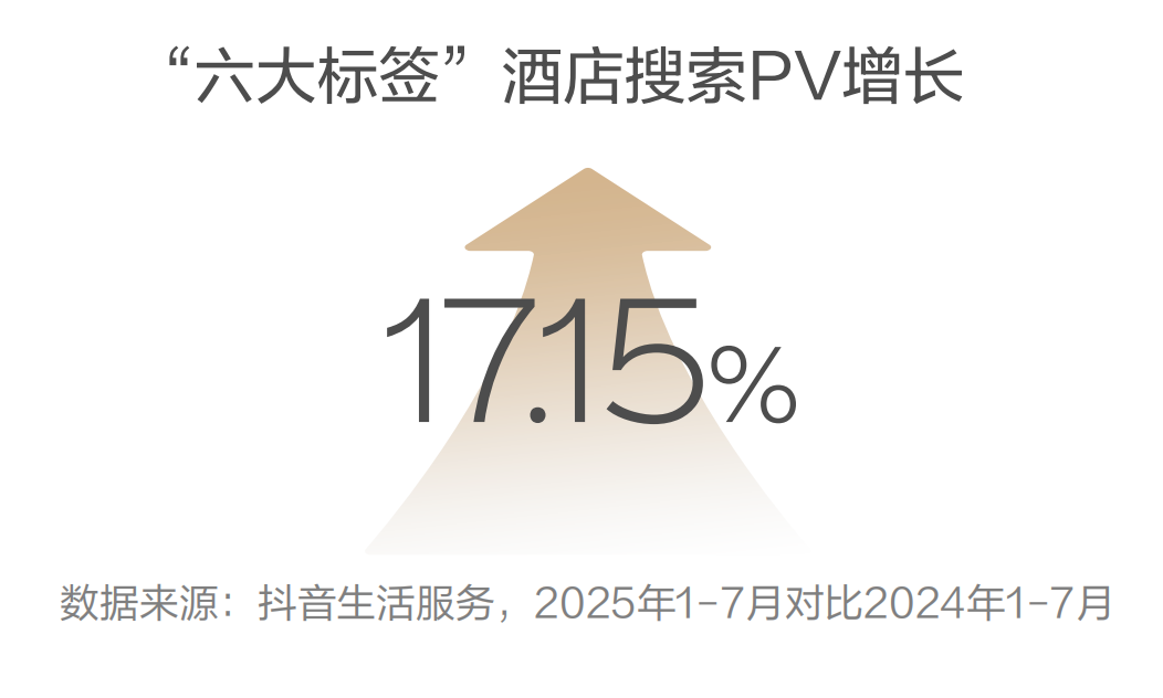 六大标签让酒店更吸睛。抖音通过“六大特色标签”构建内容营销生态,推动特色生活方式酒店实现“流量-转化-增长”的闭环突破。从数据看,抖音持续释放魅力,“六大标签”酒店激活用户主动搜索稳定增长。2025年上半年,六大标签酒店总搜索PV较2024年同期增长17.15%。