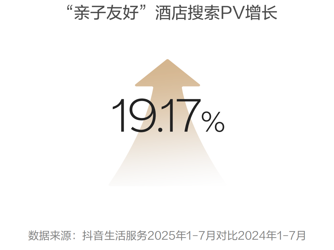 亲子友好:家庭出行的“省心解决方案”。当前,带娃家庭在抖音平台挑选酒店时,对酒店的功能定位已突破传统“住宿空间”范畴,转而将其视为“全家欢乐体验的省心解决方案”。从抖音平台数据来看,“亲子友好”主题酒店的市场表现尤为亮眼:2025年上半年,该主题酒店搜索量较上年同期增长19.17%;尽管相关视频数量仅占生活方式酒店总视频量的8.01%,但其播放量占比达12.4%,展现出较高的用户关注度。