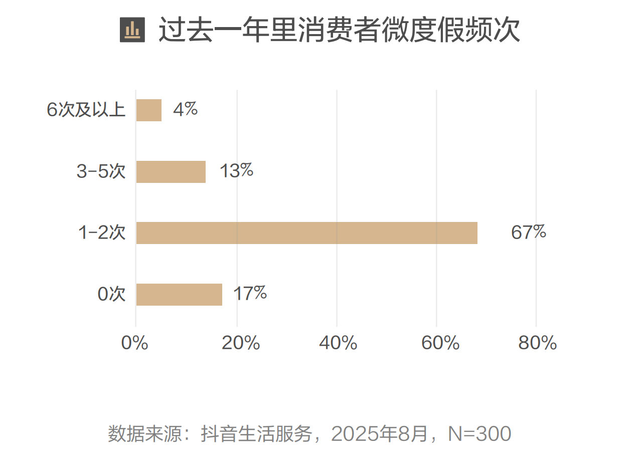 本地微度假:都市人的“去班味”救赎,酒店成短途放松核心场景。职场压力的持续叠加,让“高频、短途”的本地微度假成为都市人常态化的疗愈方式。在过去一年中,83%的消费者有微度假(1-3天短途游)经历,其中67%每年1-2次,17%的消费者每年微度假3次及以上。