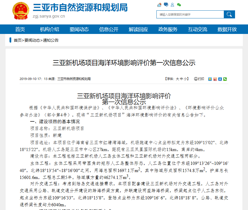 直至2019年9月,海南省三亚市自然资源和规划局公布了《三亚新机场人工岛工程环境影响评价第一次信息公示》,这意味着2年前曾被叫停的海南三亚红塘湾新机场人工岛填海项目得以重新启动。
