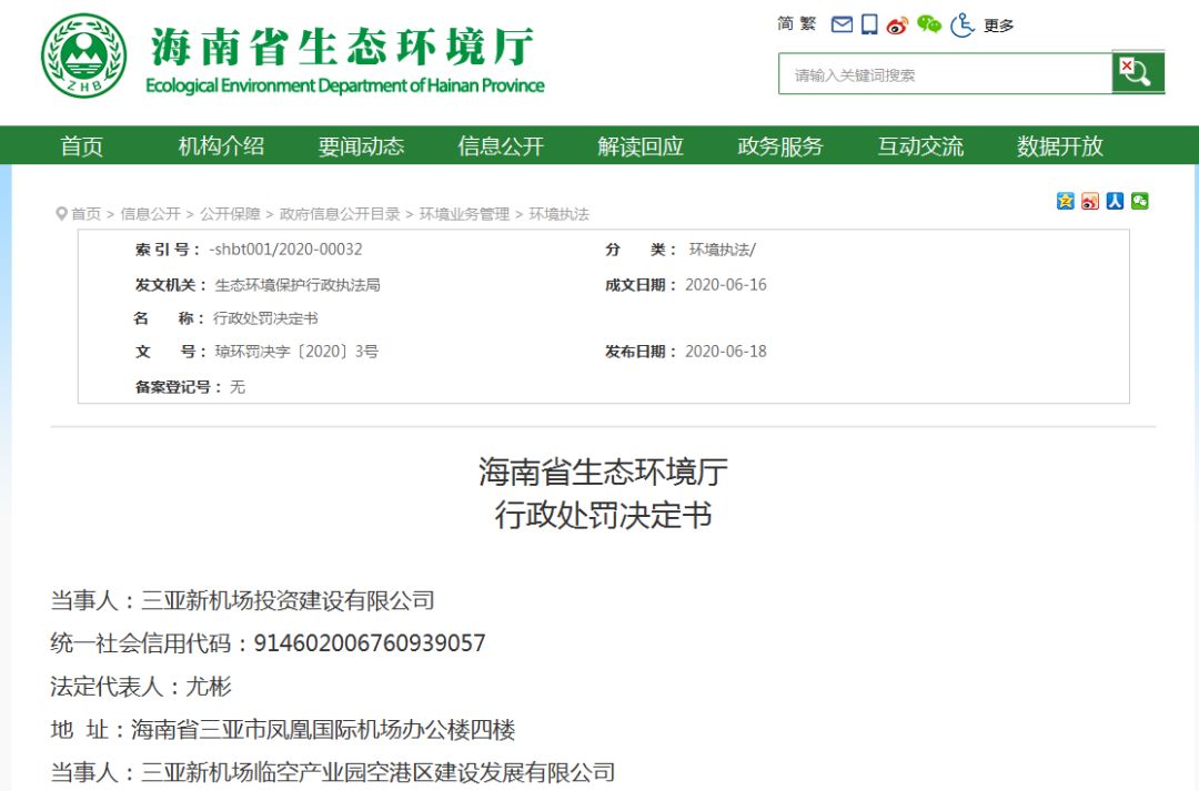 6月23日,海南省生态环境厅近日披露的一份行政处罚决定书显示,三亚新机场投资建设有限公司、三亚新机场临空产业园空港区建设发展有限公司因未编制海洋环境影响报告书并未经海洋行政主管部门审查批准建设海洋工程暨三亚新机场临空国际旅游商贸区填海工程,被海南省生态环境厅处以“责令停止施工,处人民币8000万的罚款,并恢复原状”的行政处罚。
