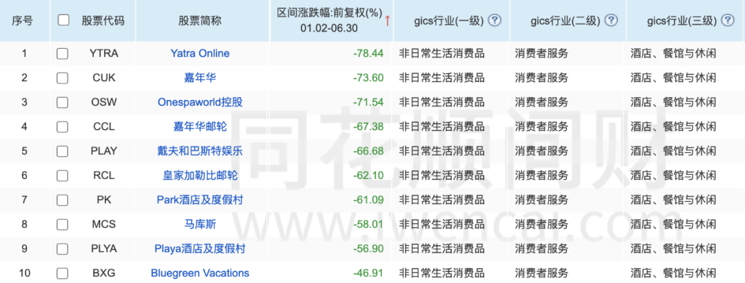 国际旅游企业上半年跌幅前十 (图源:问财)