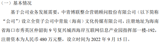 近日,中青博联发布公告,基于公司业务发展需要,中青博联整合营销顾问股份有限公司设立全资子公司中青旅(海南)文化传媒有限公司,注册地址为海南省海口市秀英区仲韶街9号复兴城西海岸互联网信息产业园指挥部一楼-192,注册资本为人民币480万元整,设立时间为2022年9月15日。