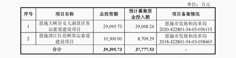 此次IPO上市,鄂旅股份也是计划募集资金约3.78亿元,拟将投向“恩施大峡谷女儿湖景区客运索道建设项目”和“恩施清江红花峡客运索道建设项目”,两个项目投资资金金额分别约为2.91亿元和8709.29万元。