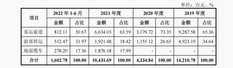 2019年至2021年以及2022年1-6月(以下简称报告期),鄂旅股份的客运索道收入占总收入的比例分别为65.36%、73.35%、63.59%和50.67%,虽然近期占比有所下滑,但公司仍有超过半数的收入来自客运索道业务。