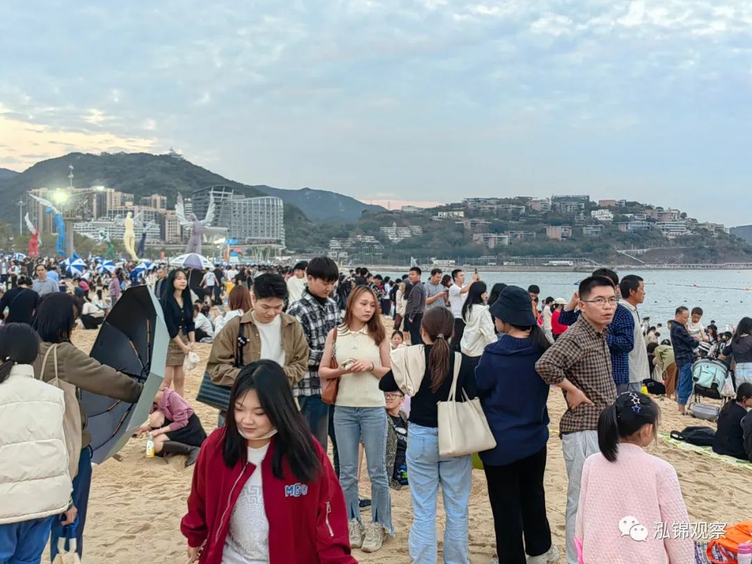第二天去大梅沙客流更是比海浪还浪,海滩上根本不是能否下饺子的问题,而是能否下脚的问题,新开通运营不久的大梅沙地铁站不得不整日都启用大客流应急预案,稍微停留整理一下衣物都会被管理人员轮番催促。