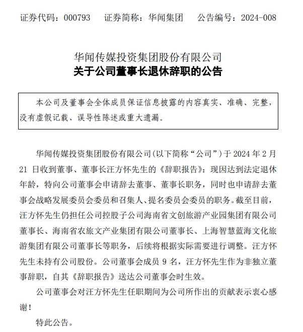 华闻集团称,公司于2024年2月21日收到董事、董事长汪方怀的《辞职报告》:现因达到法定退休年龄,特向公司董事会申请辞去董事、董事长职务,同时也申请辞去董事会战略发展委员会委员和召集人、提名委员会委员的职务。
