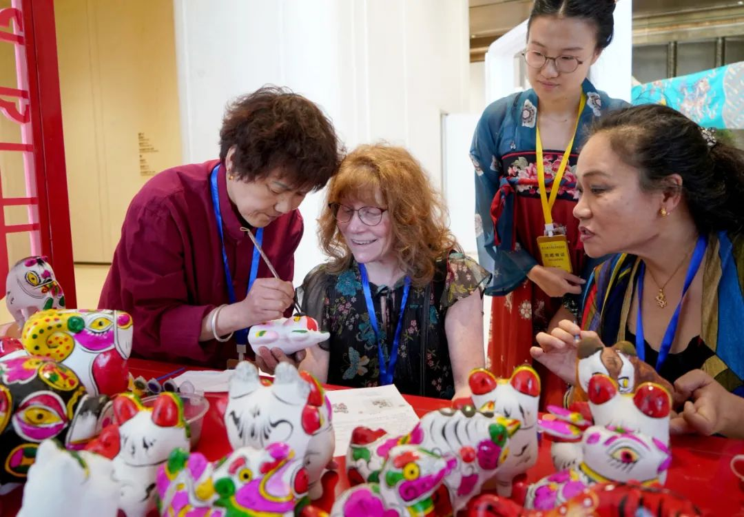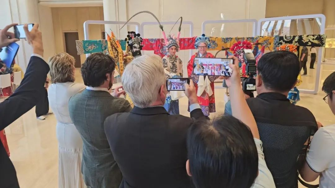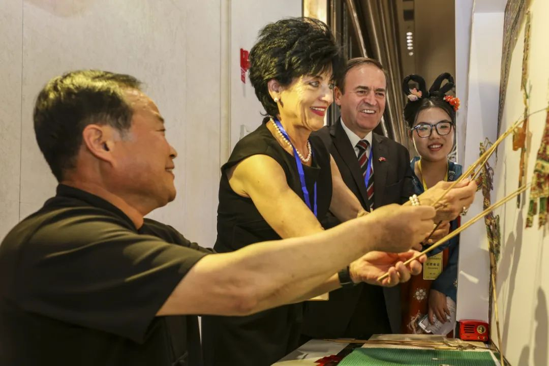 推介会前,参会的两国嘉宾体验了精心布置的陕西非遗互动展。历史悠久、深受中外游客喜爱的人类非遗代表作——中国皮影,独具陕西特色的旬邑彩贴剪纸、凤翔木版年画和秦腔等,作为中华文化特色标识精彩亮相。大家驻足停留,聆听非遗传承人们的精彩讲解,拍摄记录独具匠心的非遗物件,亲身体验秦腔戏服、皮影展演等特色非遗项目,为本次陕西之行留下美好的记忆。
