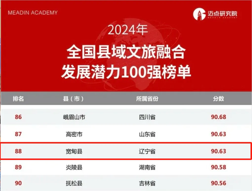 近日,浙江迈点研究院独家发布“2024年全国县域文旅融合综合竞争力100强榜单”及“2024年全国县域文旅融合发展潜力100强榜单”。全省总计四地上榜,均为辽宁县域历年首次上榜,其中就包括丹东东港市和宽甸县两地,占全省一半比例。东港市以95.98分上榜“2024年全国县域文旅融合综合竞争力100强榜单”;宽甸县以90.63分上榜“2024年全国县域文旅融合发展潜力100强榜单”,可喜可贺!