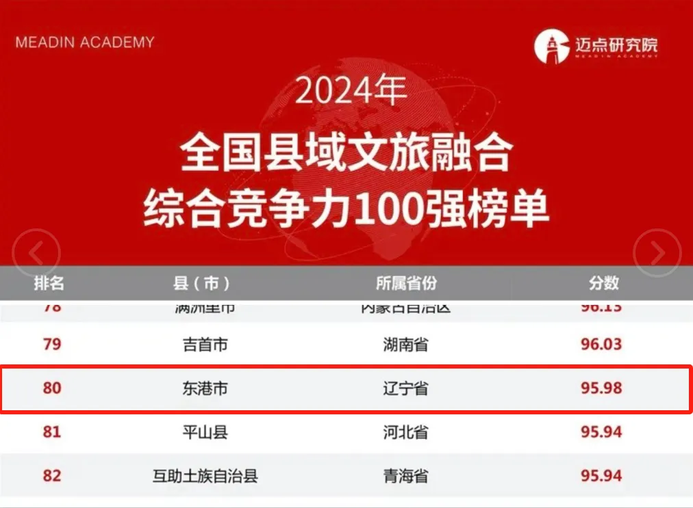 东港市以95.98分上榜“2024年全国县域文旅融合综合竞争力100强榜单”,宽甸县以90.63分上榜“2024年全国县域文旅融合发展潜力100强榜单”。