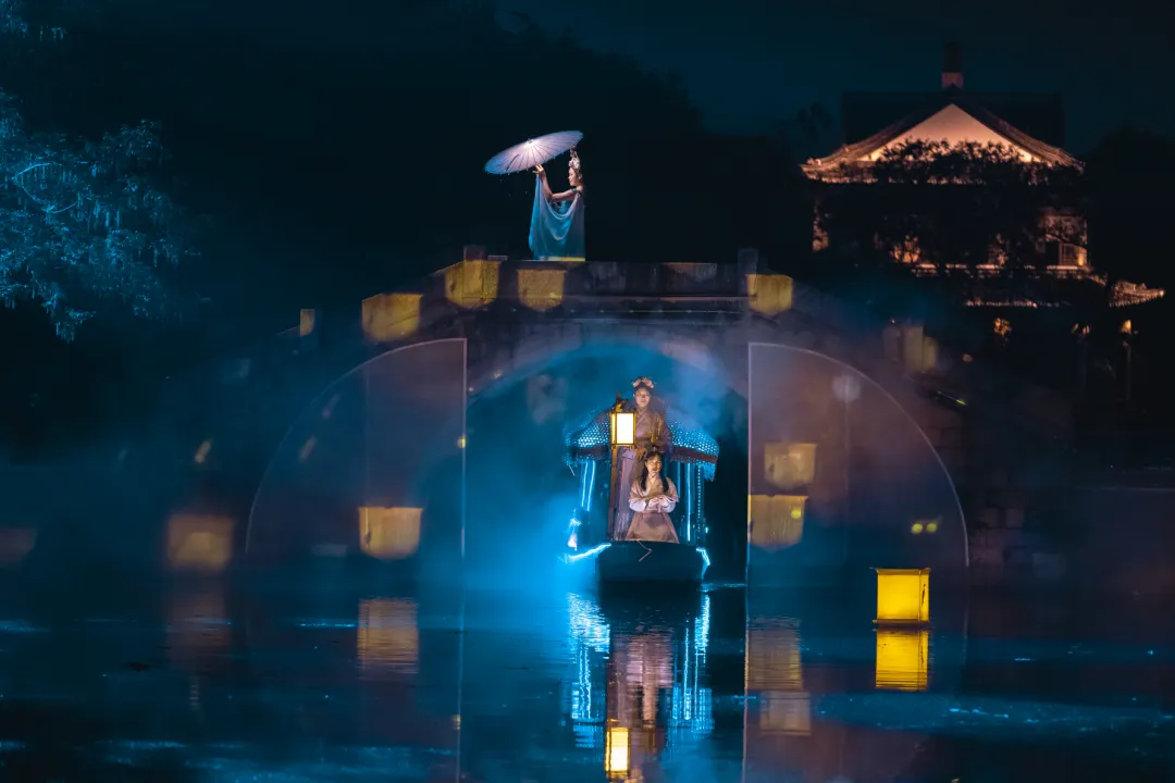 夜幕降临,西溪湿地则换上了另一副迷人的面纱。《今夕共西溪》夜间演艺震撼登场,深情讲述南宋名臣洪皓与妻子沈氏的家国情怀与忠贞爱情,让观众在光影交错间穿越时空隧道,亲历那段动人心魄的历史篇章。