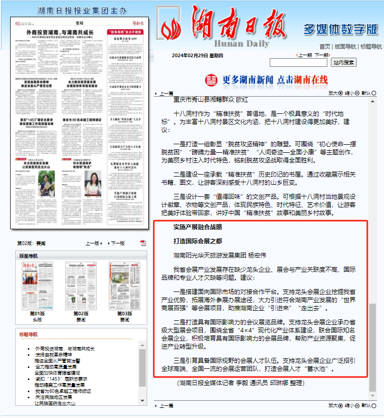 湖南旅游集团党委书记、董事长杨宏伟撰写的《实施产展融合战略 打造国际会展之都》获《湖南日报》摘登。