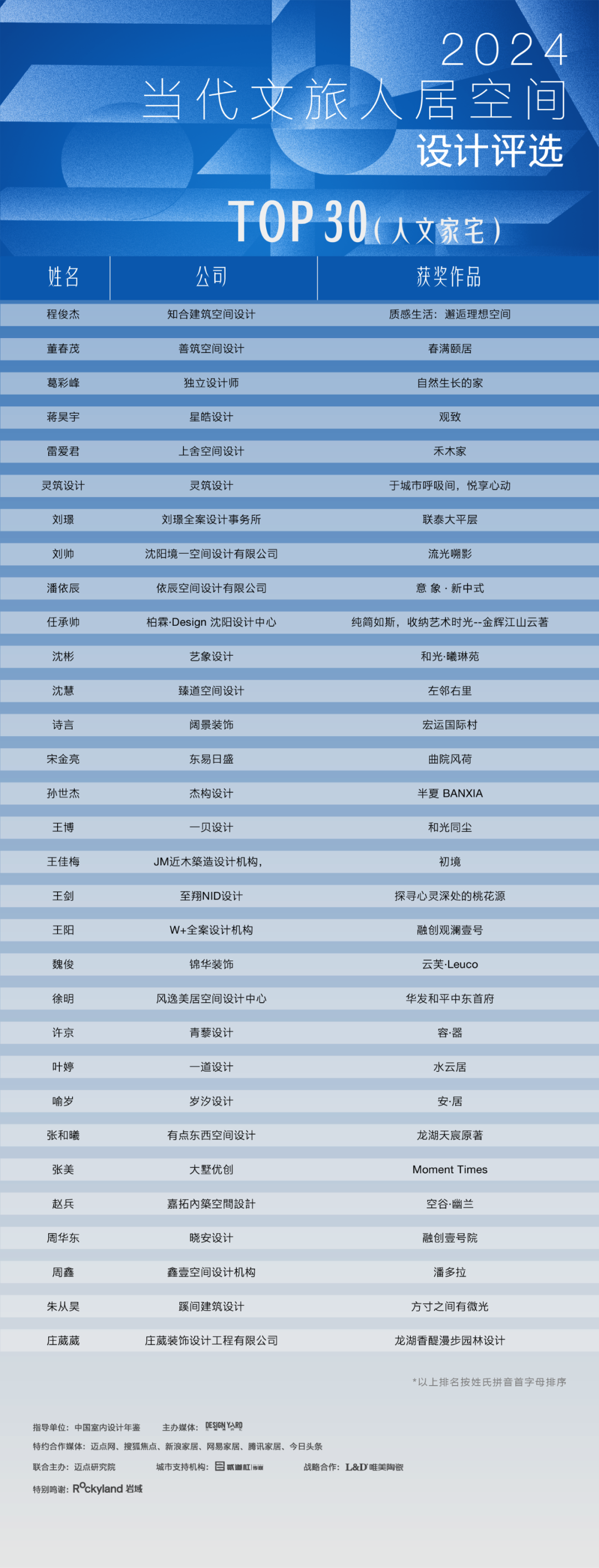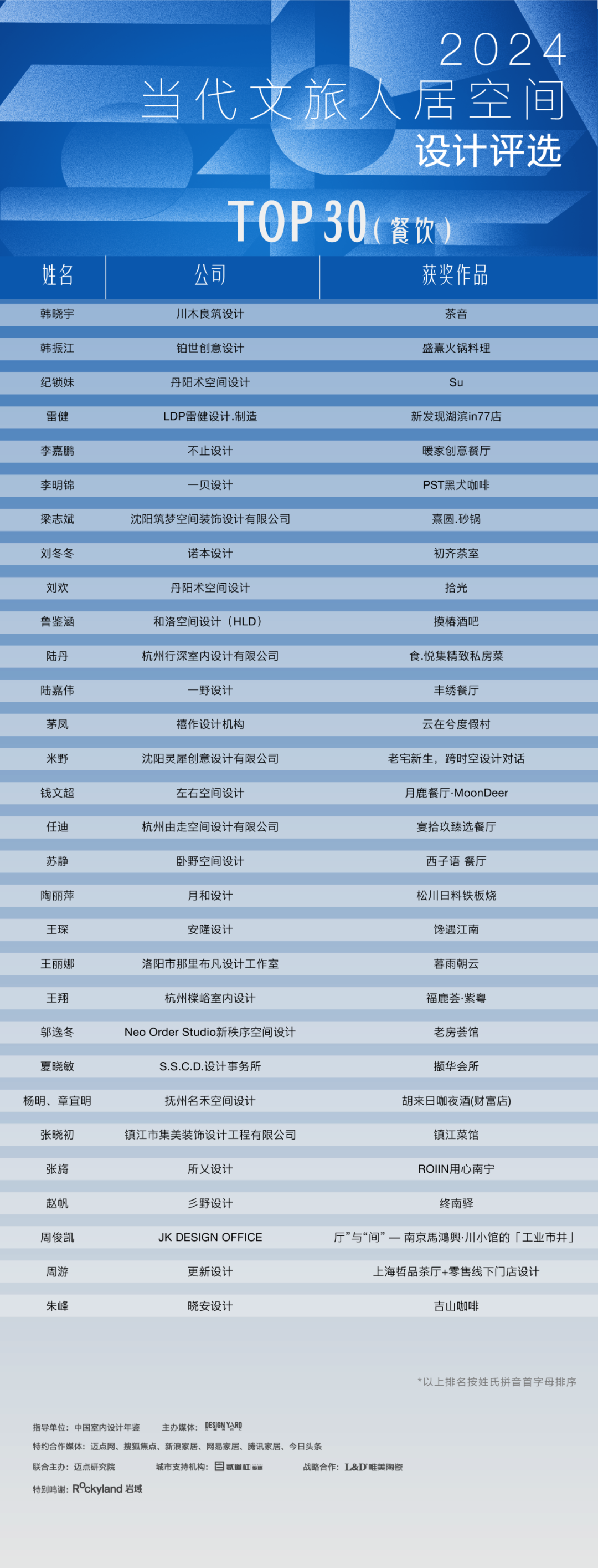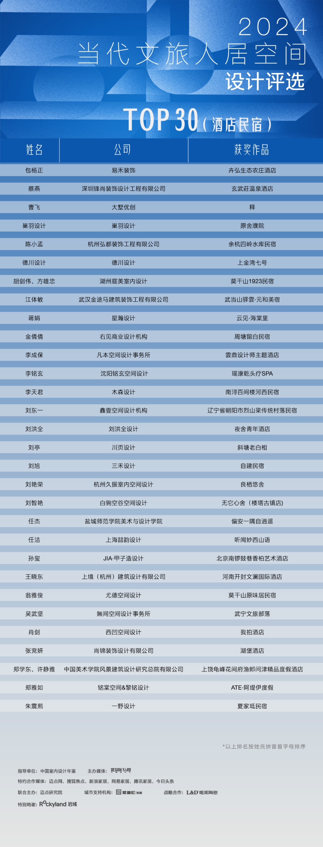 恭喜以上作品荣登2024当代文旅人居空间设计TOP30榜单,并将进入2024当代文旅人居空间设计WINNER(每个类别不超过10个)、2024当代文旅人居空间设计BEST OF BEST(每个类别仅限1个)的角逐之列。