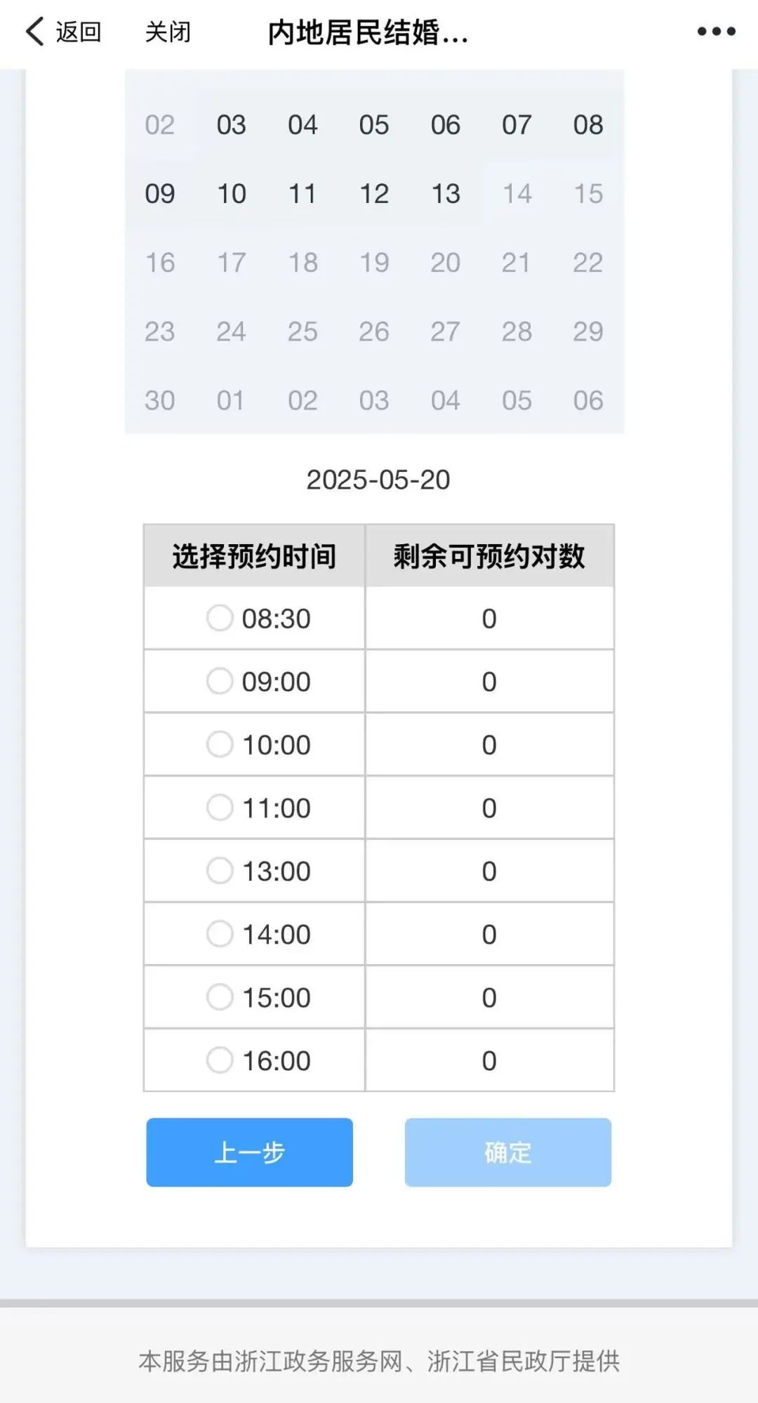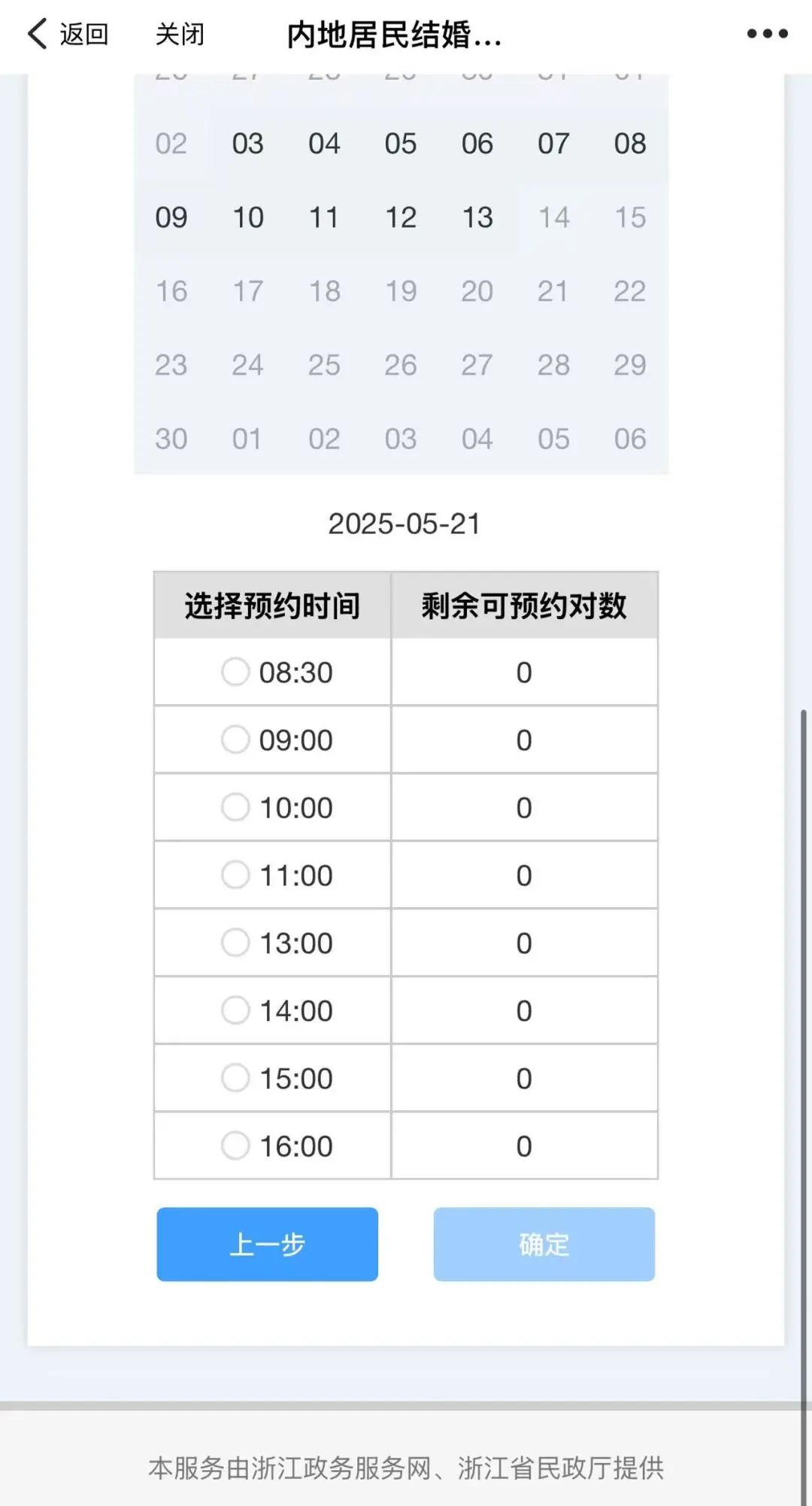 不少人特地选这个特殊的日子进行登记,为结婚赋予更大意义。与此同时,5月另两个谐音“我爱你”的日子——520、521也是办理婚姻登记的热门。浙里办预约结果显示浪漫杭城的婚姻登记处已经都被约满,无独有偶,苏州市婚姻登记处“520”和“521”的预约已经全部约满。