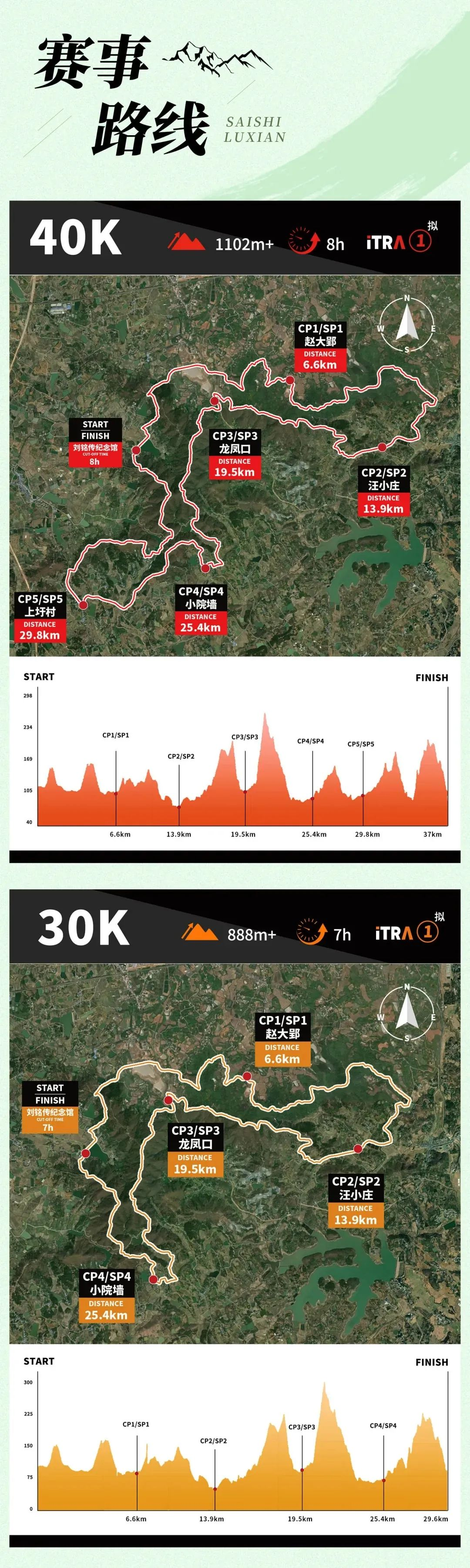 赛事设置潜龙腾渊40km组、铁衣破晓30km组、牧野逐风20km组和家山拾趣10km组四个组别,各组别难度较低,老少皆宜。以40km组为例,累计爬升1102m,关门时间为8h,作为入门级的越野赛道,非常适合您来挑战。