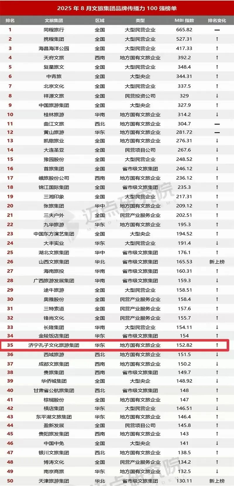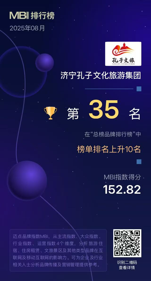 济宁孔子文旅集团位居“2025年8月文旅集团品牌传播力100强榜单”全国第35位 济宁孔子文化旅游集团 · 2025-09-12 18:24:56 分享到 打开微信“扫一扫”,打开网页后点击屏幕右上角分享按钮。 山东省第一名。 9月12日,迈点研究院公布《2025年8月中国文旅集团发展报告》,济宁孔子文旅集团位居“2025年8月文旅集团品牌传播力100强榜单”全国第35位,山东省第一名。 济宁孔子文化旅游集团 0