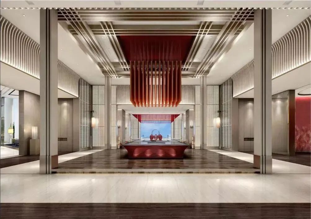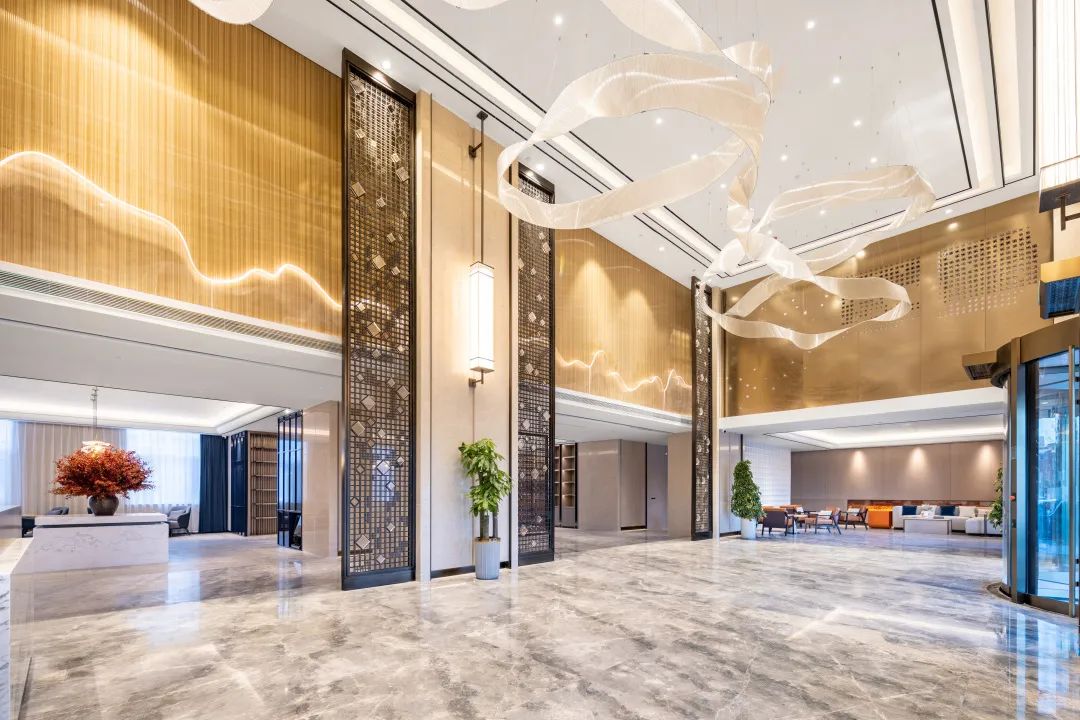 常州金坛万豪酒店室内设计由PLD刘波设计事务所担纲,灵感源于金坛区著名风光景点茅山的峰峦叠翠以及当地悠久的历史文脉。酒店室内设计采用线条、对称元素营造空间的灵动和活力,并将金坛当地特色刻纸、乱针绣等元素巧妙地点缀于空间内饰,以现代设计风格演绎人文精粹。木质结构装饰呈现出山水的线条与肌理,展现茅山自然生态特色;而轻盈灵动的绿茶形态装置艺术品,则生动描绘江南茶乡茅山的魅力;古朴的石材造景创造自然的触感,让宾客放松身心之余,寻回内心的平静。