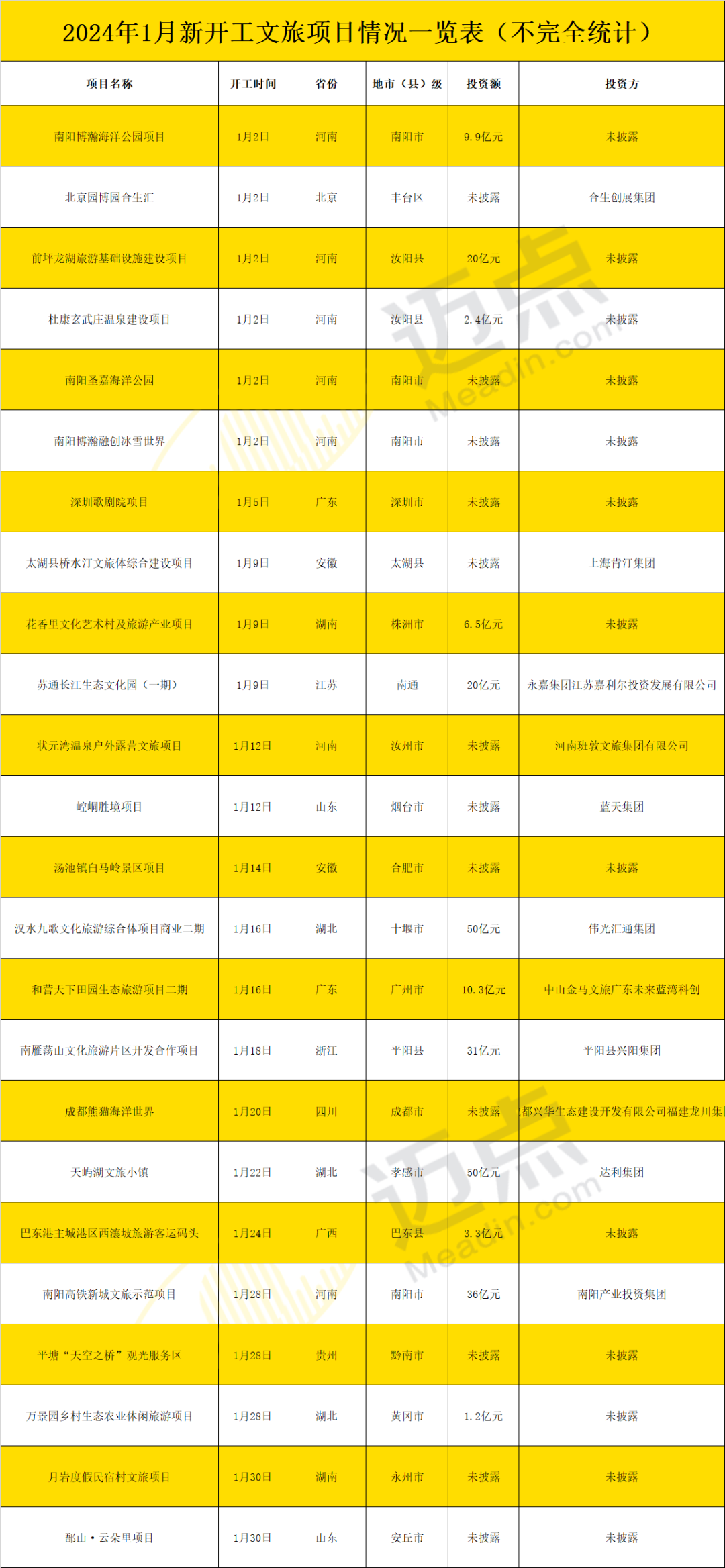 1月新开工24个文旅项目,最高金额达50亿元,涉及主题公园、温泉建设等业态