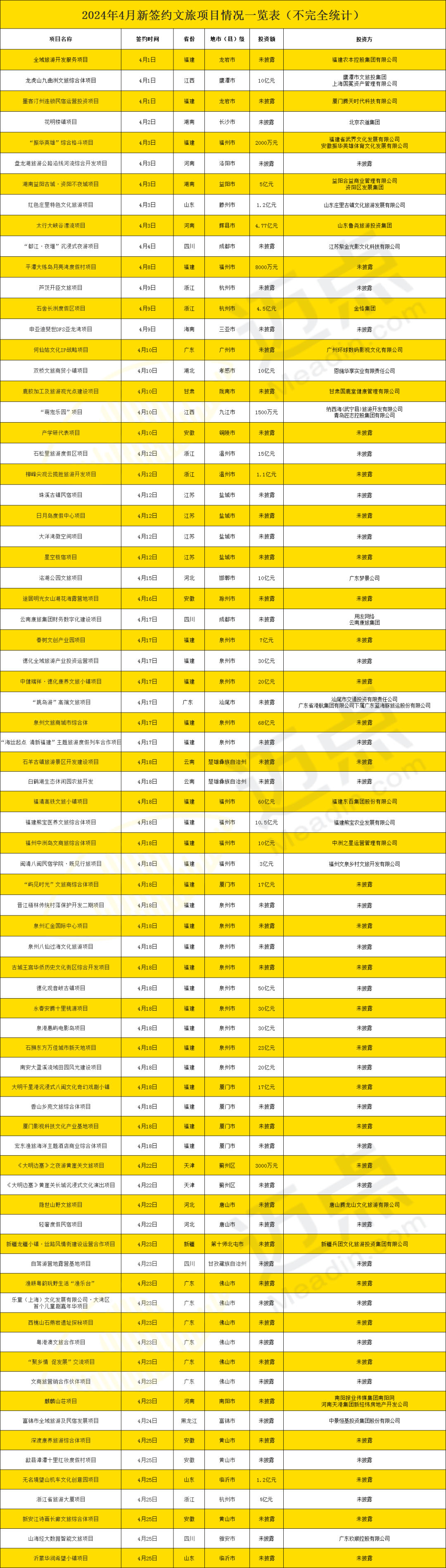 4月新签约75个文旅项目,最高投资金额达68亿元
