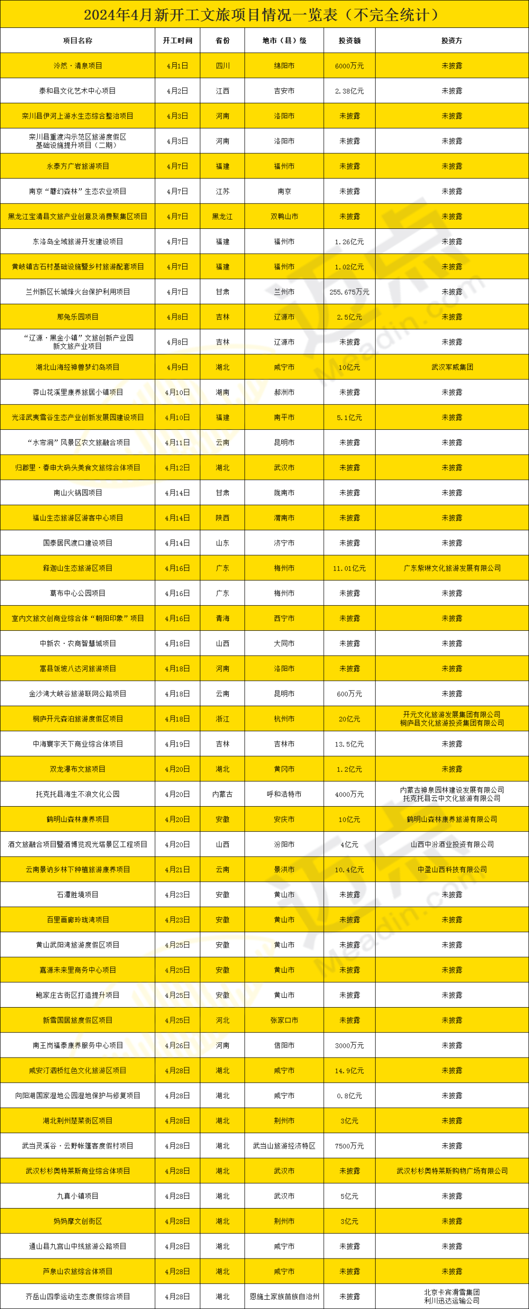 2024年,各地的文旅集团纷纷加大投资力度,推动一系列文旅项目的开工建设,据迈点不完全统计,2024年4月新开工文旅项目50个。