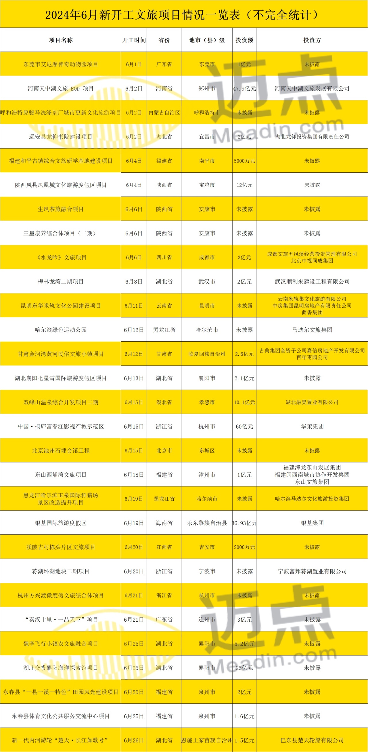 2024年,各地的文旅集团纷纷加大投资力度,推动一系列文旅项目的开工建设。据迈点不完全统计,2024年6月新开工文旅项目29个。