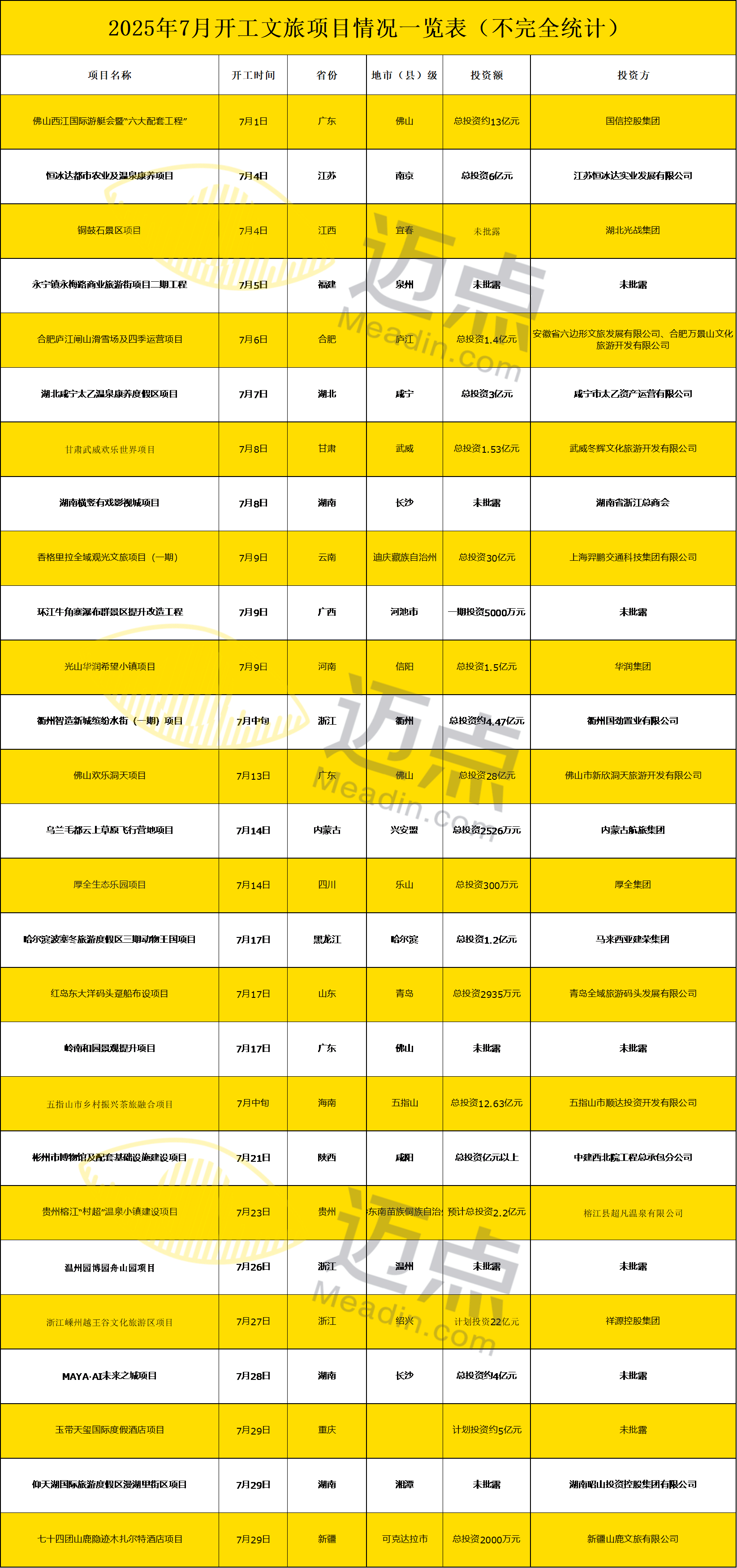 据迈点不完全统计,2025年6月新开工文旅项目27个。