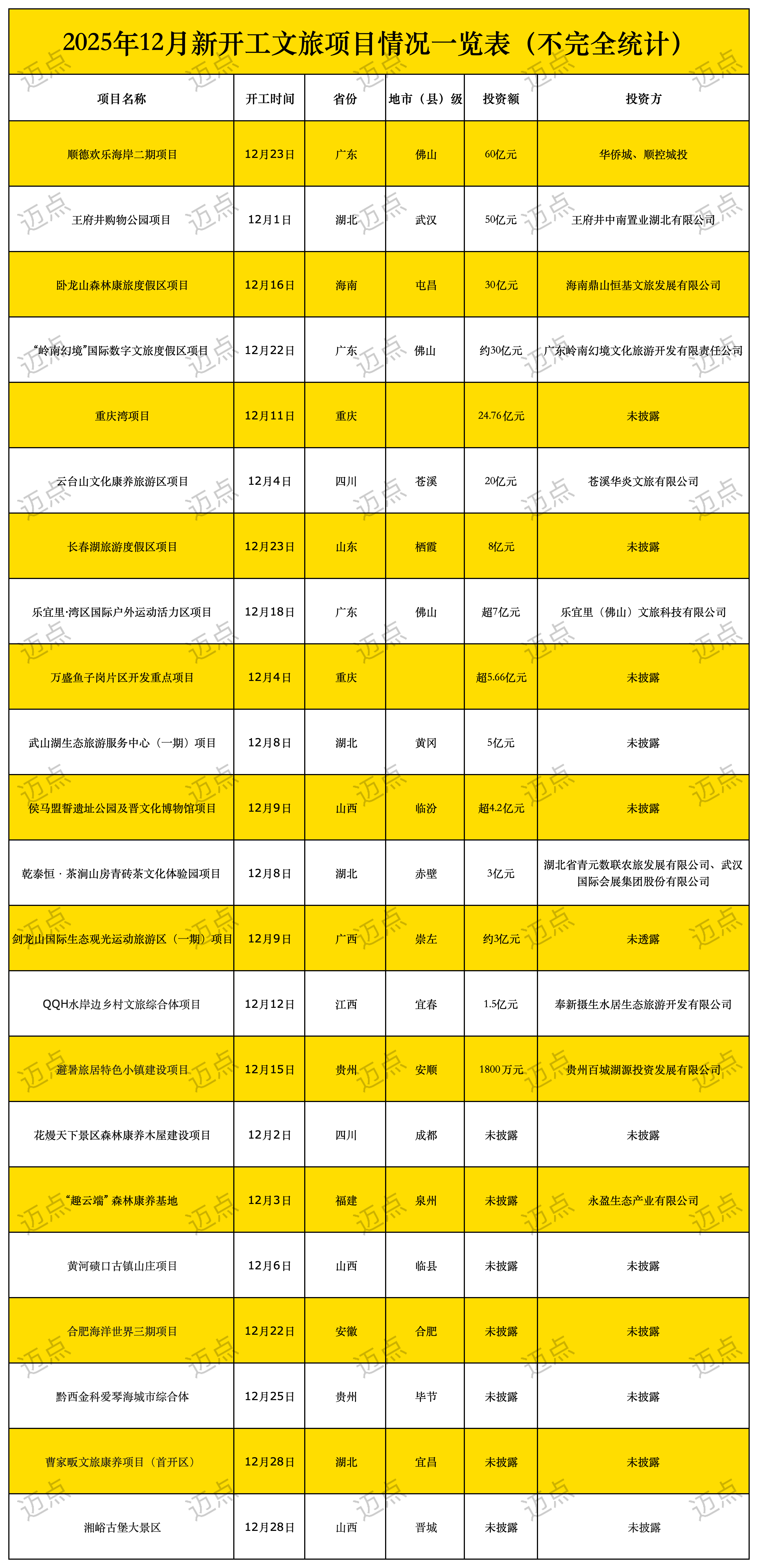 据迈点不完全统计,2025年12月新开工文旅项目22个,14个项目投资额破亿元。其中,顺德欢乐海岸二期项目投资额达60亿元,引发重点关注。